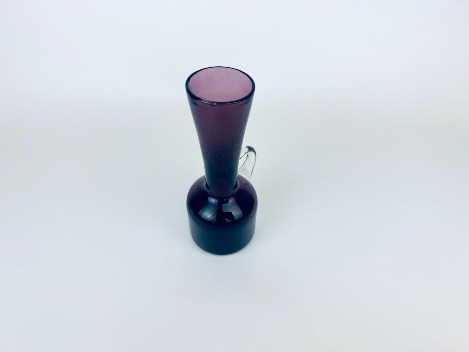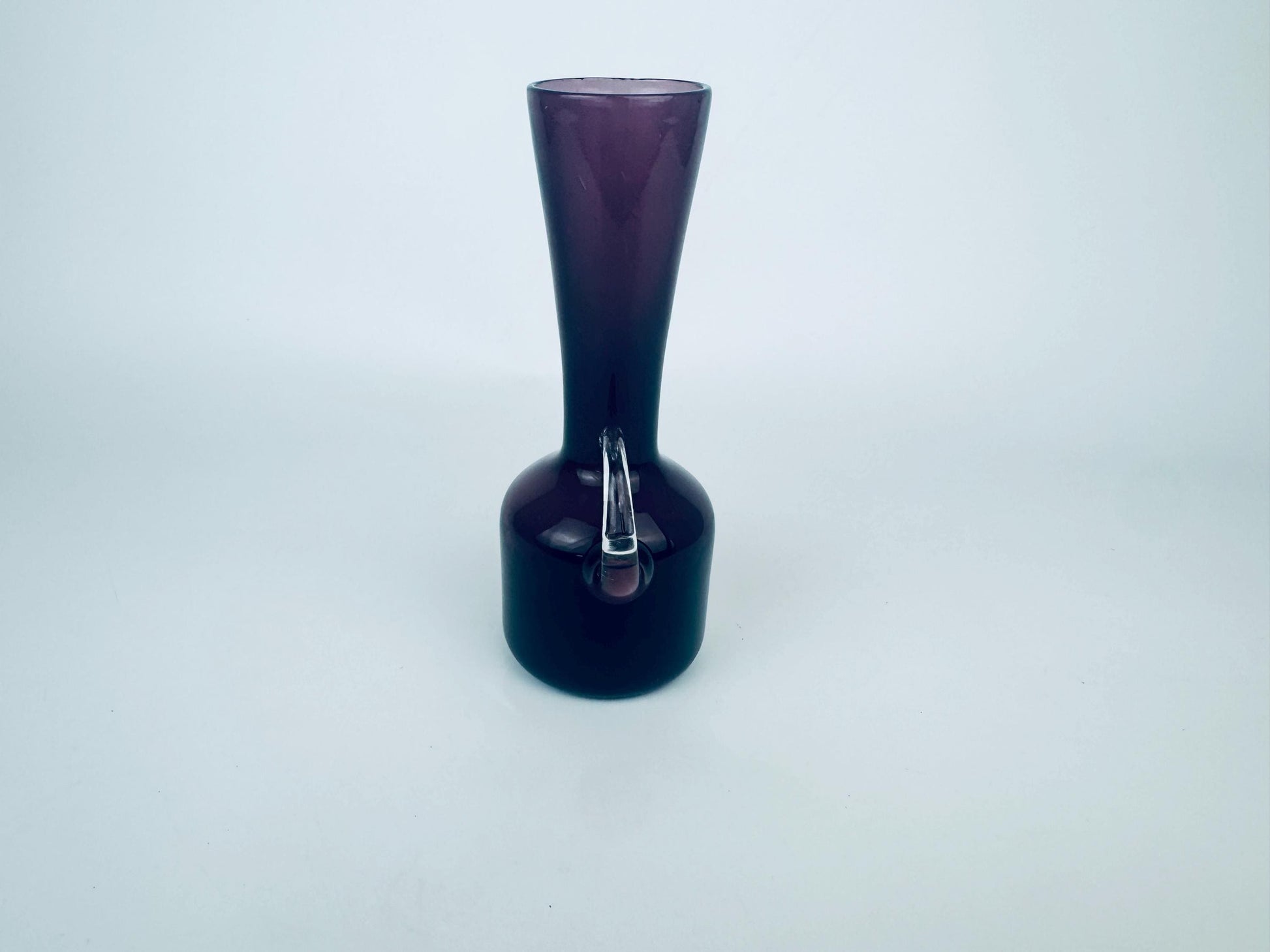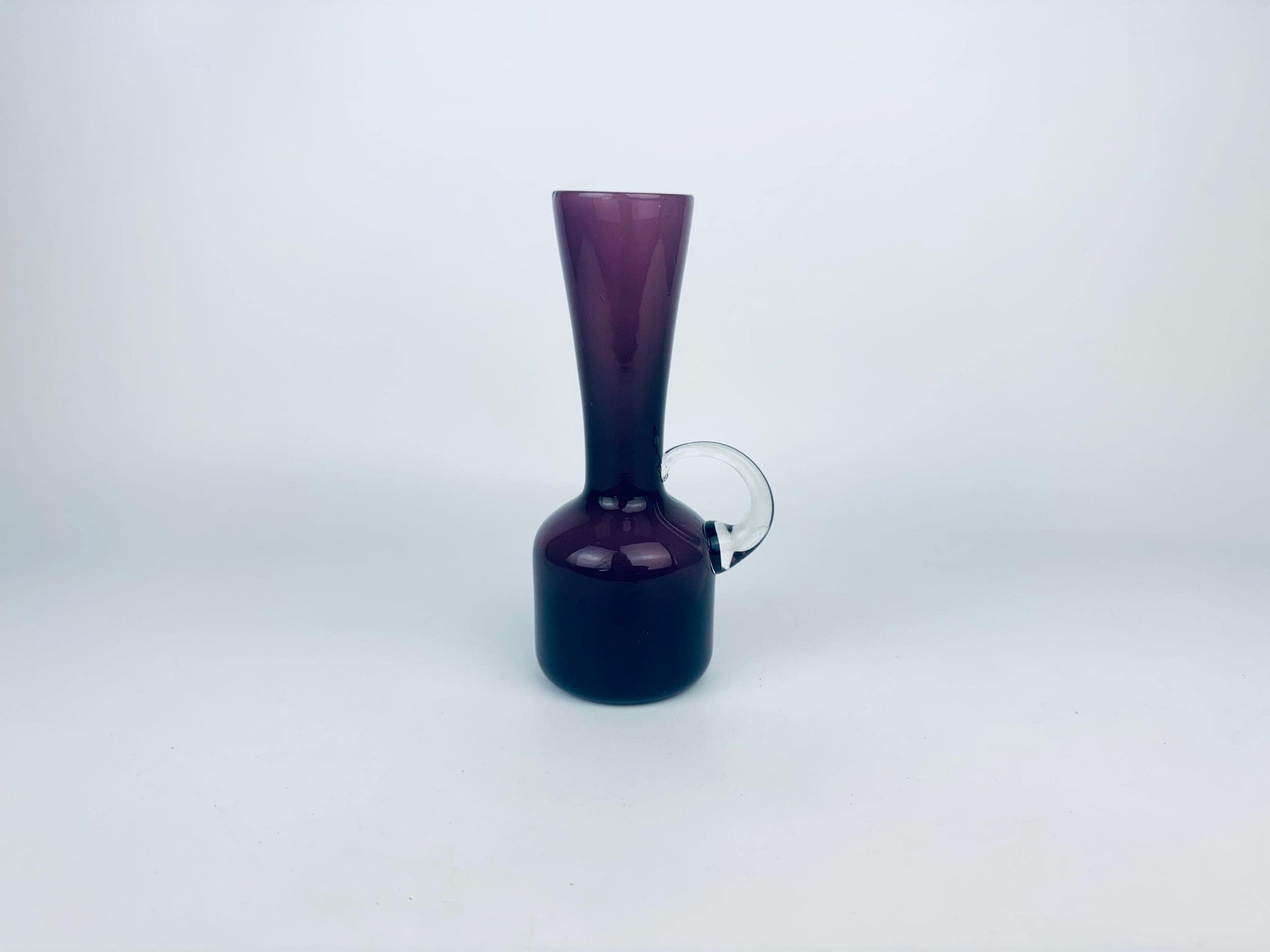 đź A sculptural silhouette in deep amethyst, this vintage blown glass jug features a strikingly minimal profile punctuated by a clear applied handle. Likely dating from the 1960s, the piece captures the eraâs shift toward bold colour and clean, modernist lines. Whether styled as a petite decanter or as a standalone accent vase, it offers moody sophistication with handcrafted appeal.