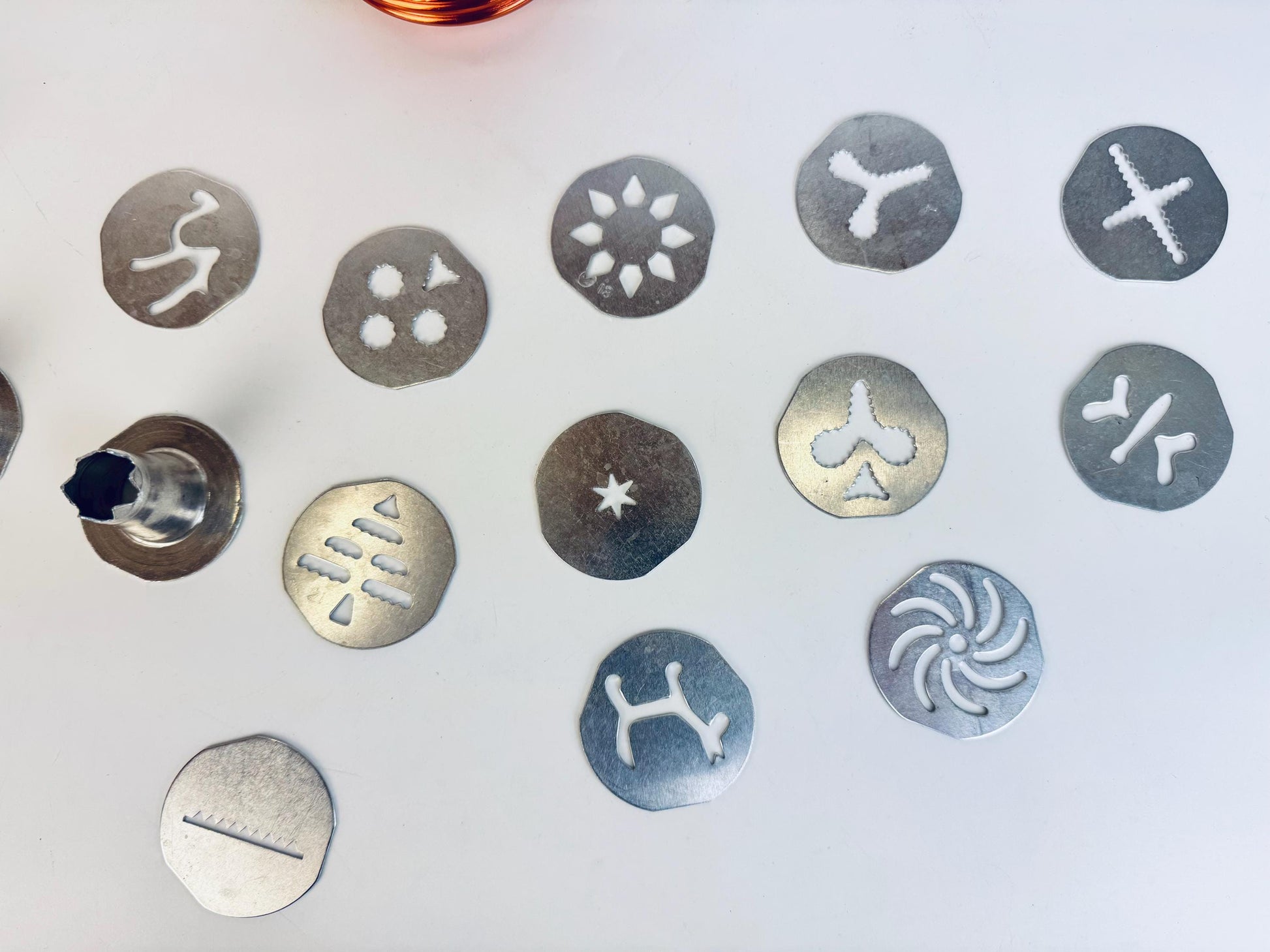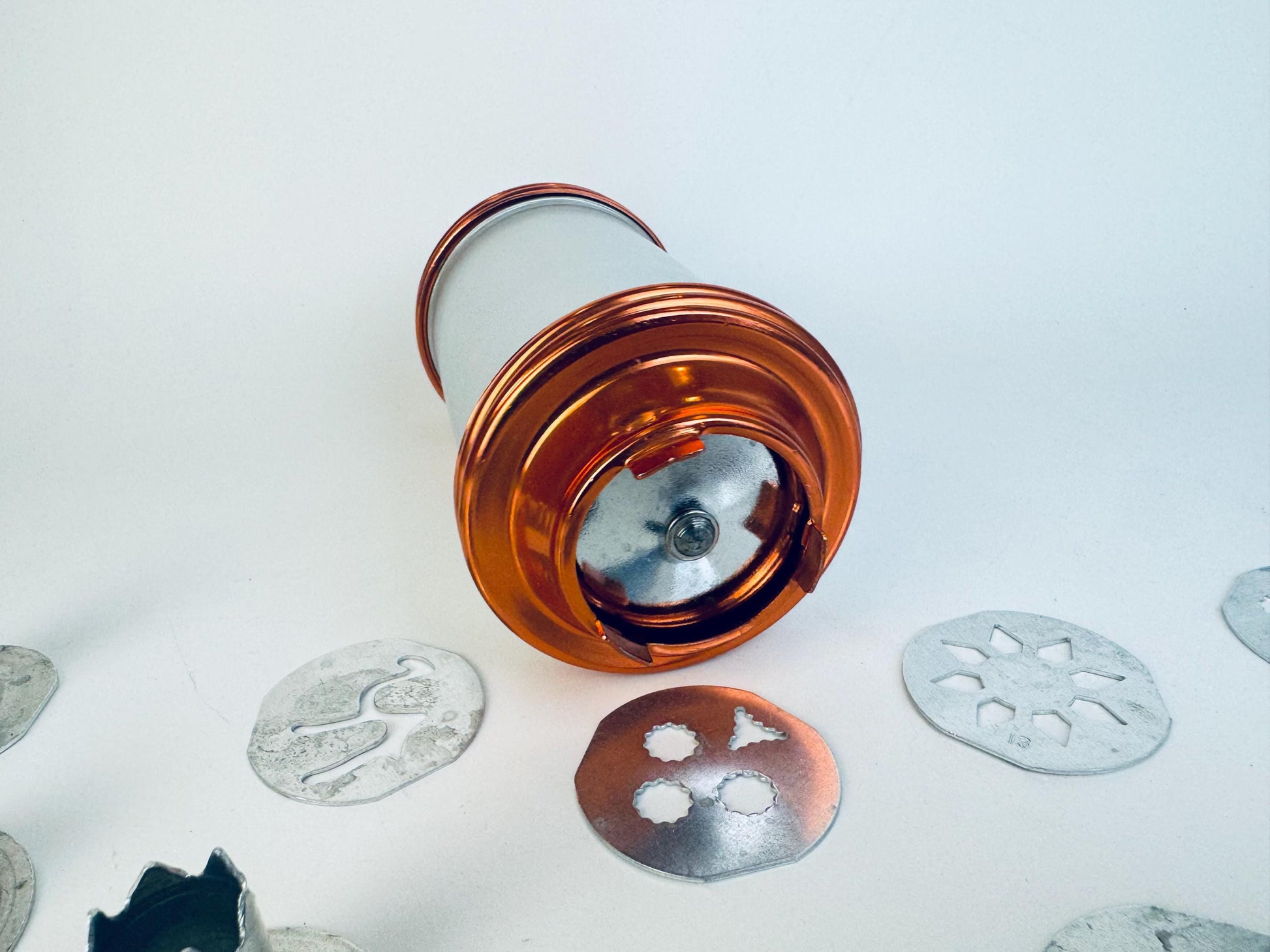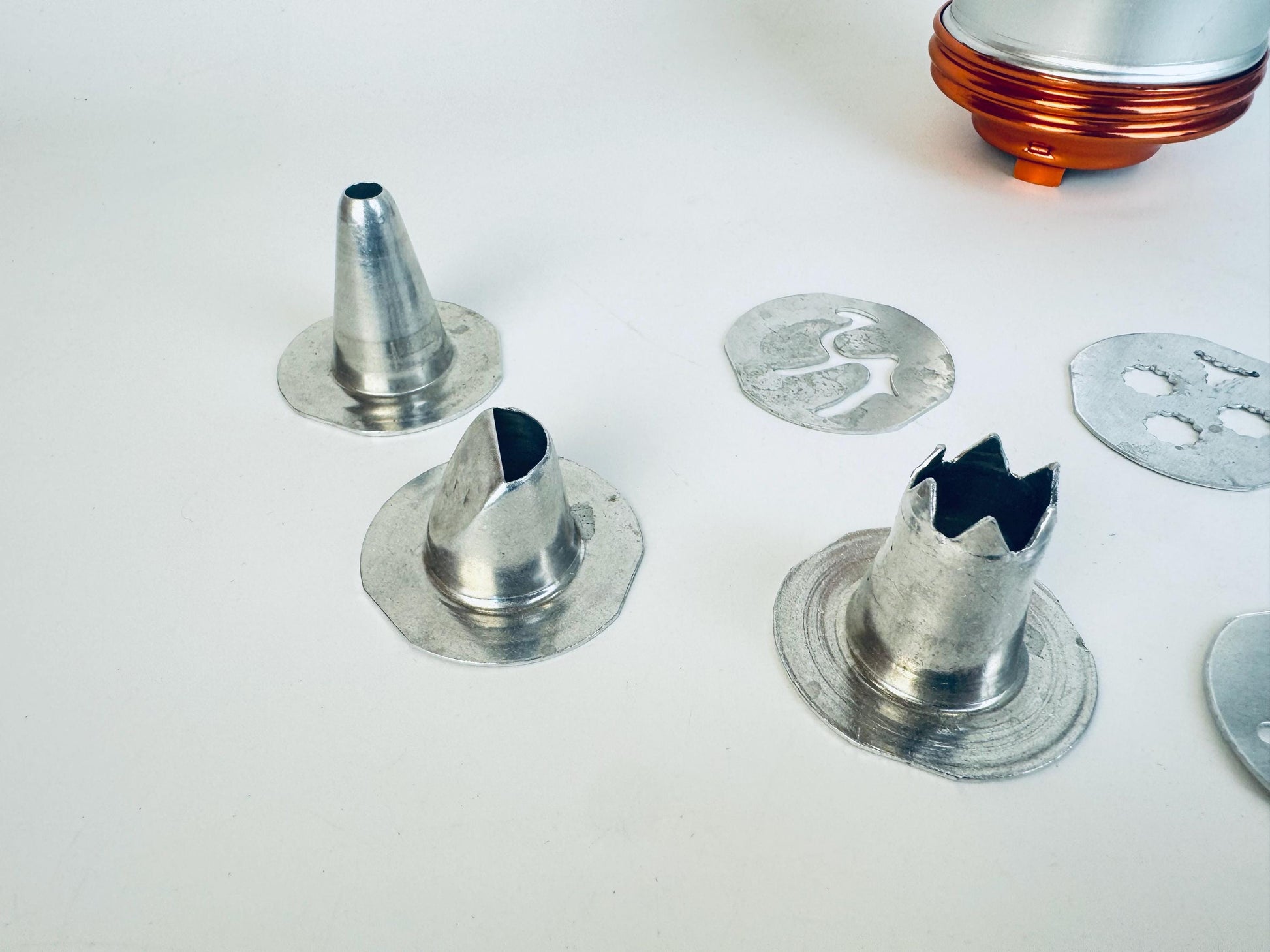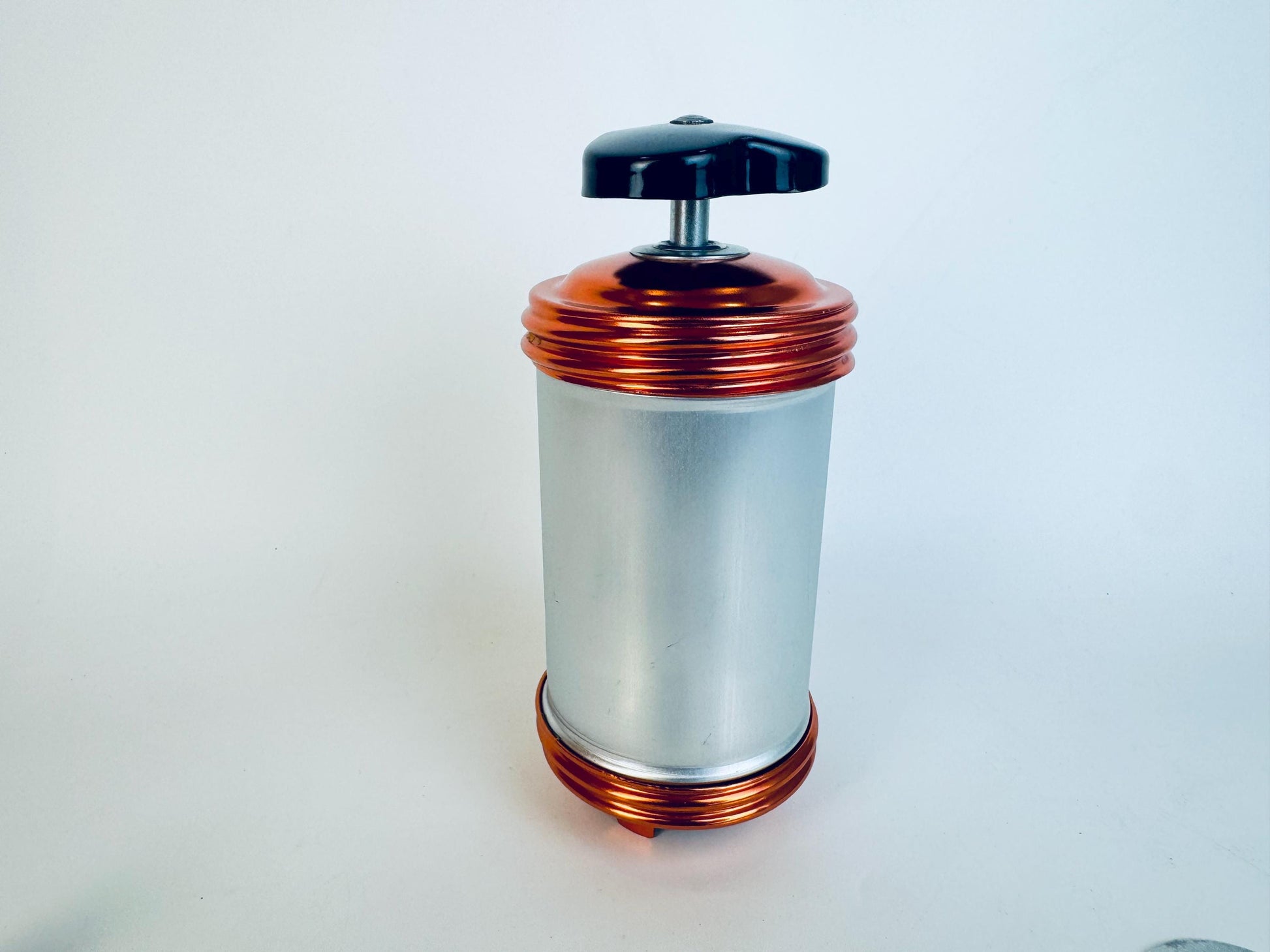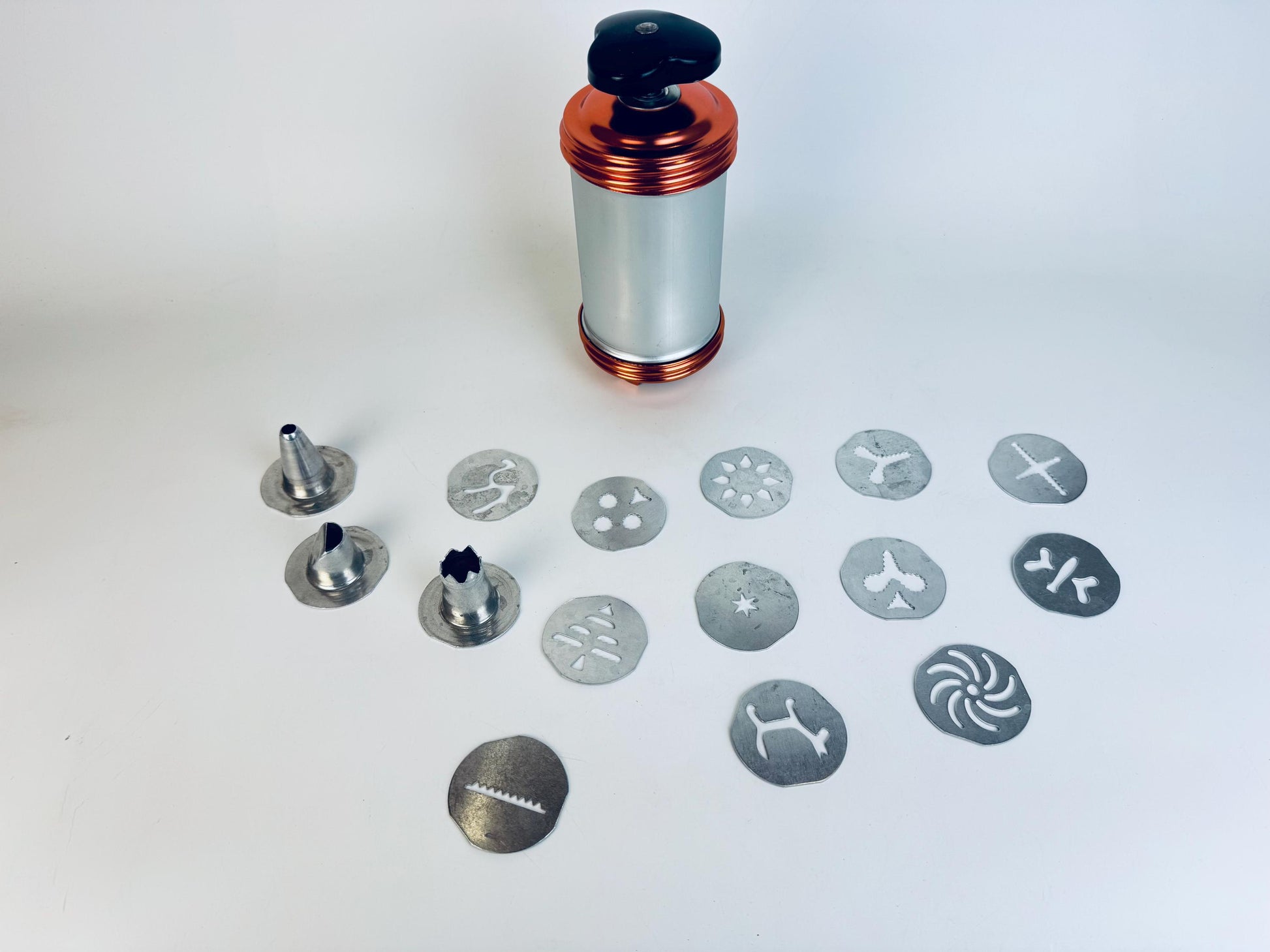 🍪 A gleaming vintage statement for your kitchen — this mid-century Mirro aluminum cookie and pastry press, with warm copper accents and a full complement of discs and tips, brings joie de vivre to holiday baking or everyday spritz making. Designed in the 1950s, its precision-cut interchangeable metal plates and ergonomic plunger deliver clean, decorative cookies with architectural grace. Use it to craft festive spritz cookies, petits fours, or even savory pressed hors d’oeuvres — and display it when not in use as a retro objet d’art.