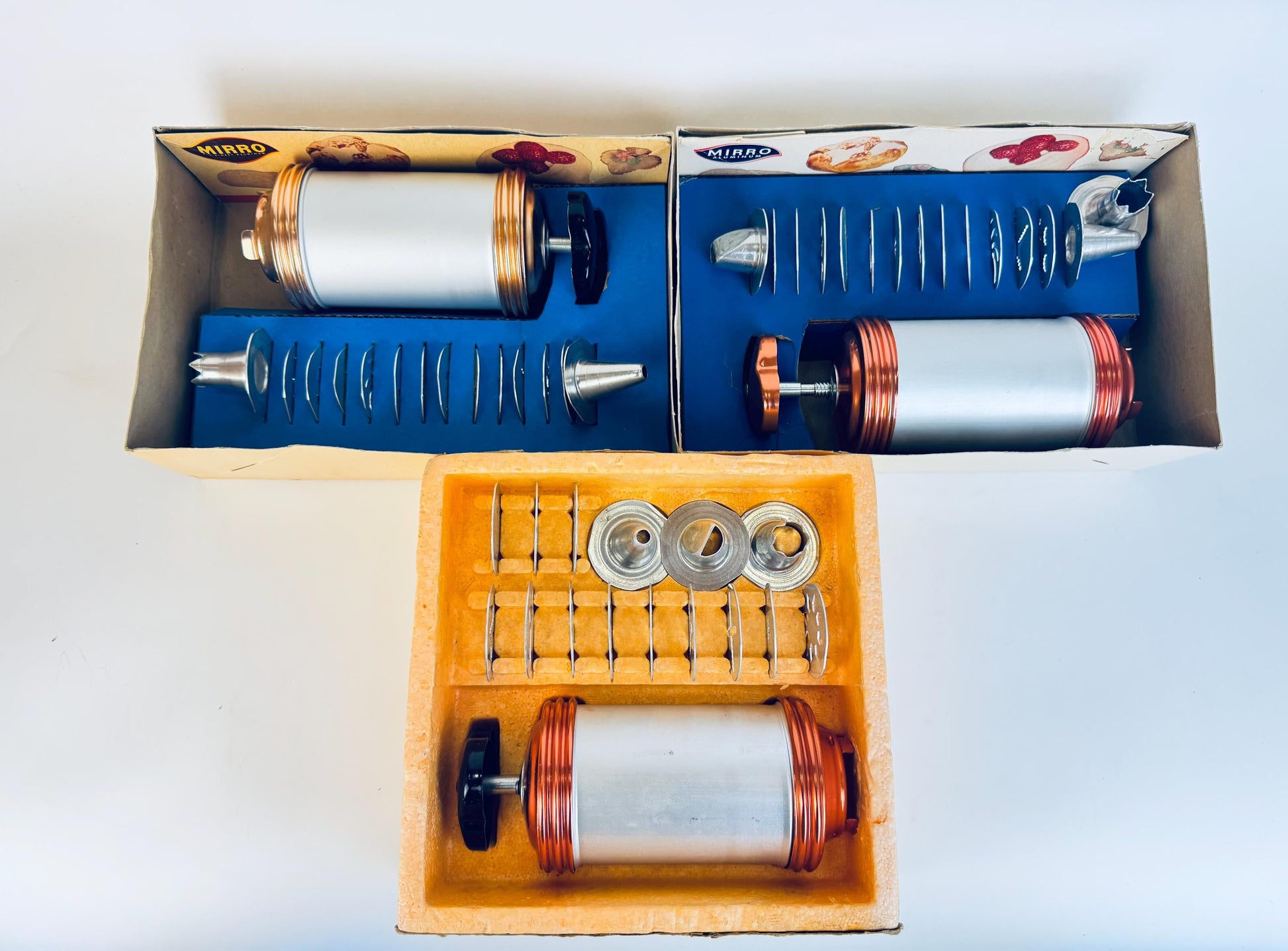 Launched under the Mirro brand (introduced in 1917) by the Aluminum Goods company in Manitowoc, Wisconsin, Mirro grew to become one of the largest aluminum cookware producers in mid-20th-century America.  This styling and finish align with Mirro’s 1950s-era promotional materials, and Smithsonian records identify a “Mirro Cooky & Pastry Press” dating to the 1950s.