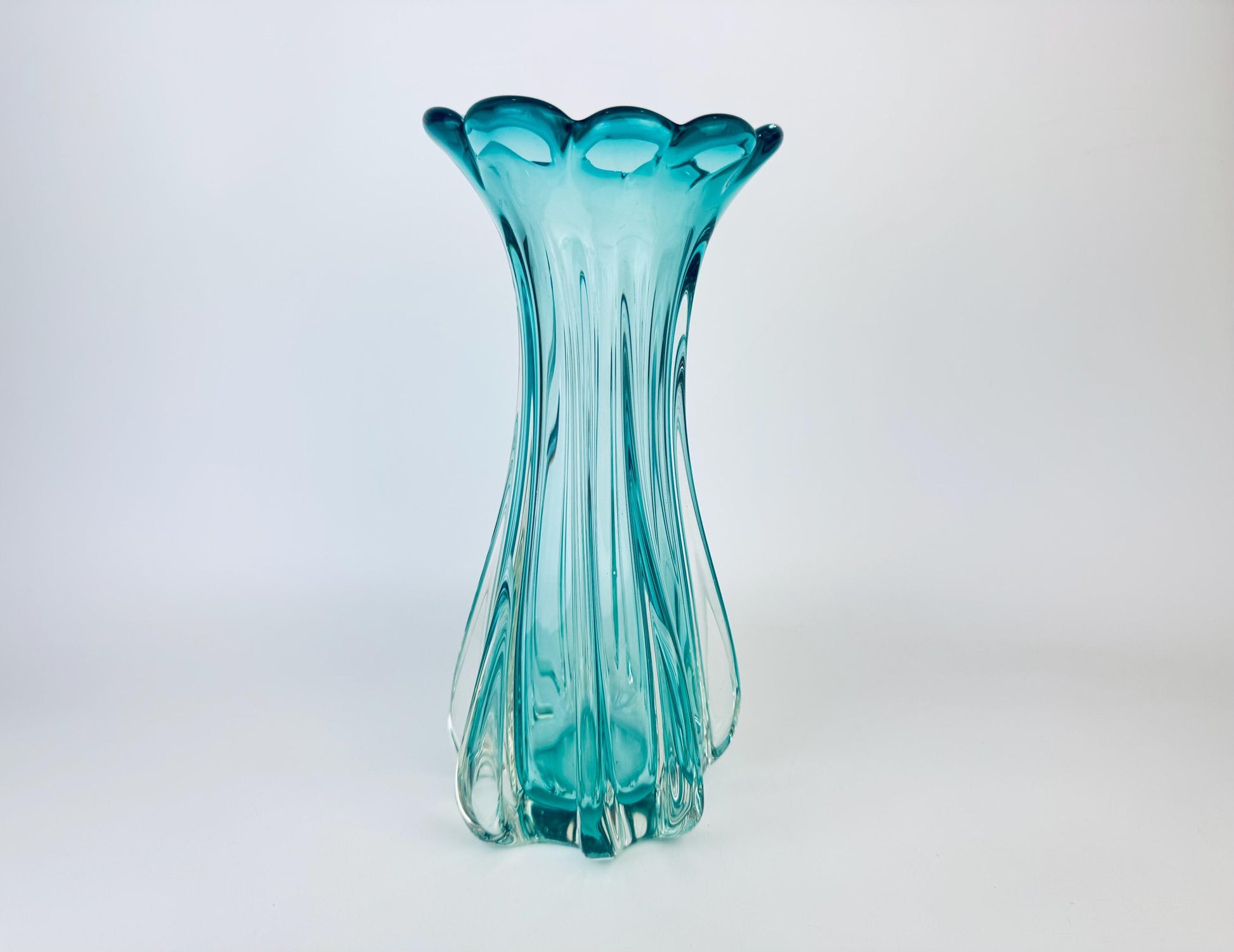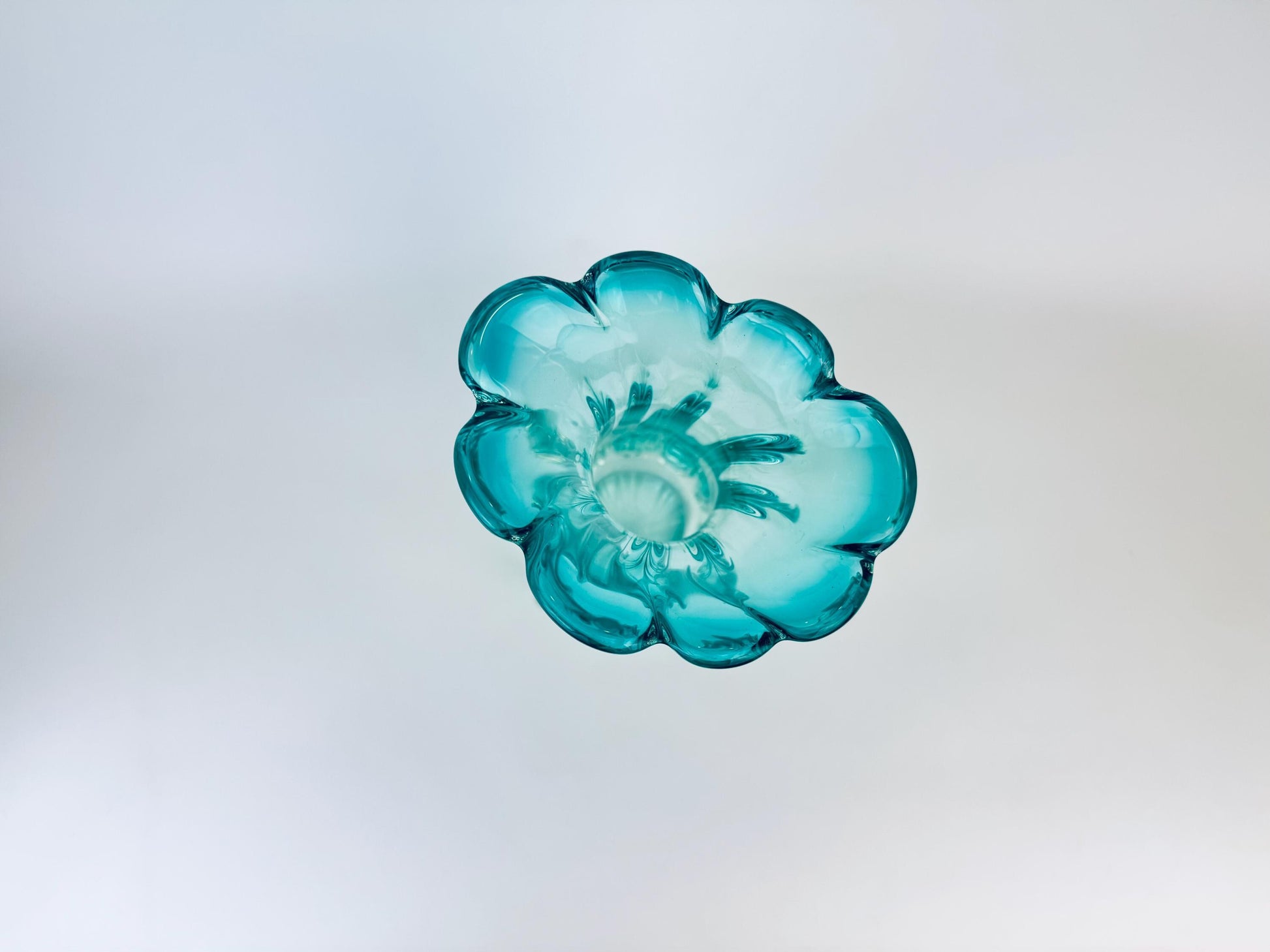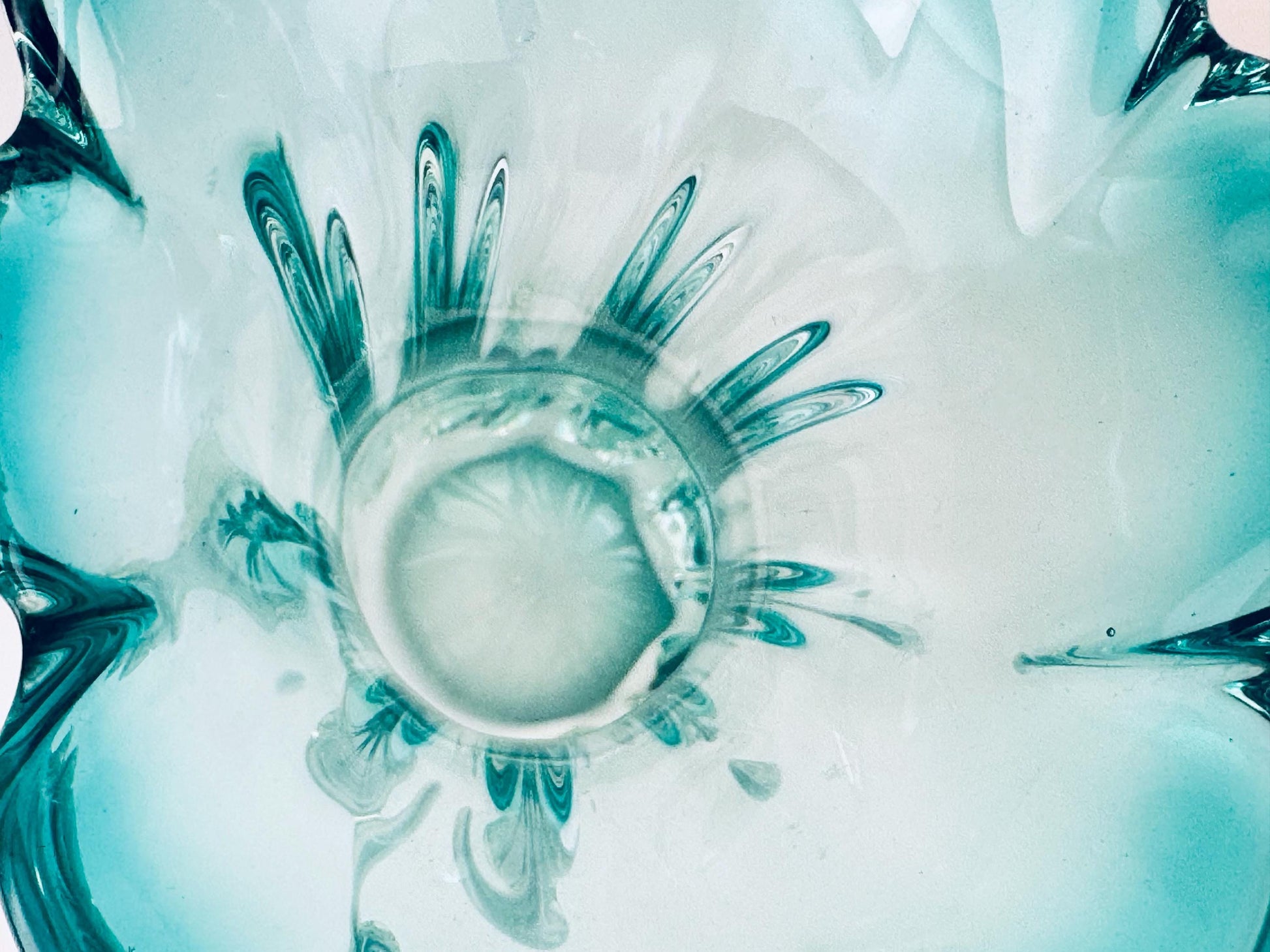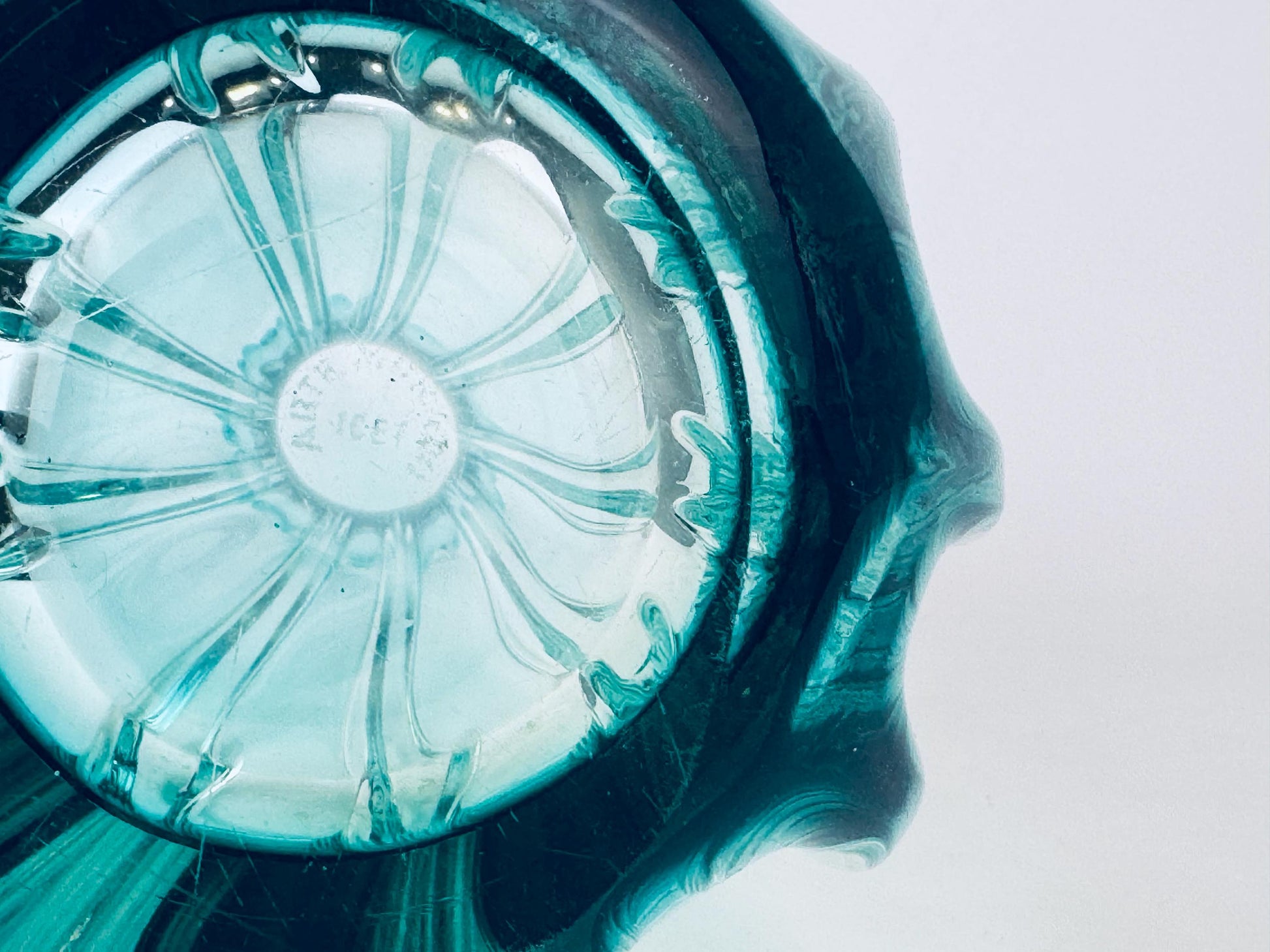 A sculptural ode to Italian artistry, this hand-blown Murano art glass vase features a rippling, organic form with a gently flared rim and rich aqua teal hue. Crafted during the 1970s–1980s, its fluid silhouette and pulled feathering make it an elegant centrepiece for consoles, mantels, or curated shelving. Acid-etched on the base with “Arte Murano ICET,” this piece reflects the refined yet expressive spirit of mid-century Murano export glass.