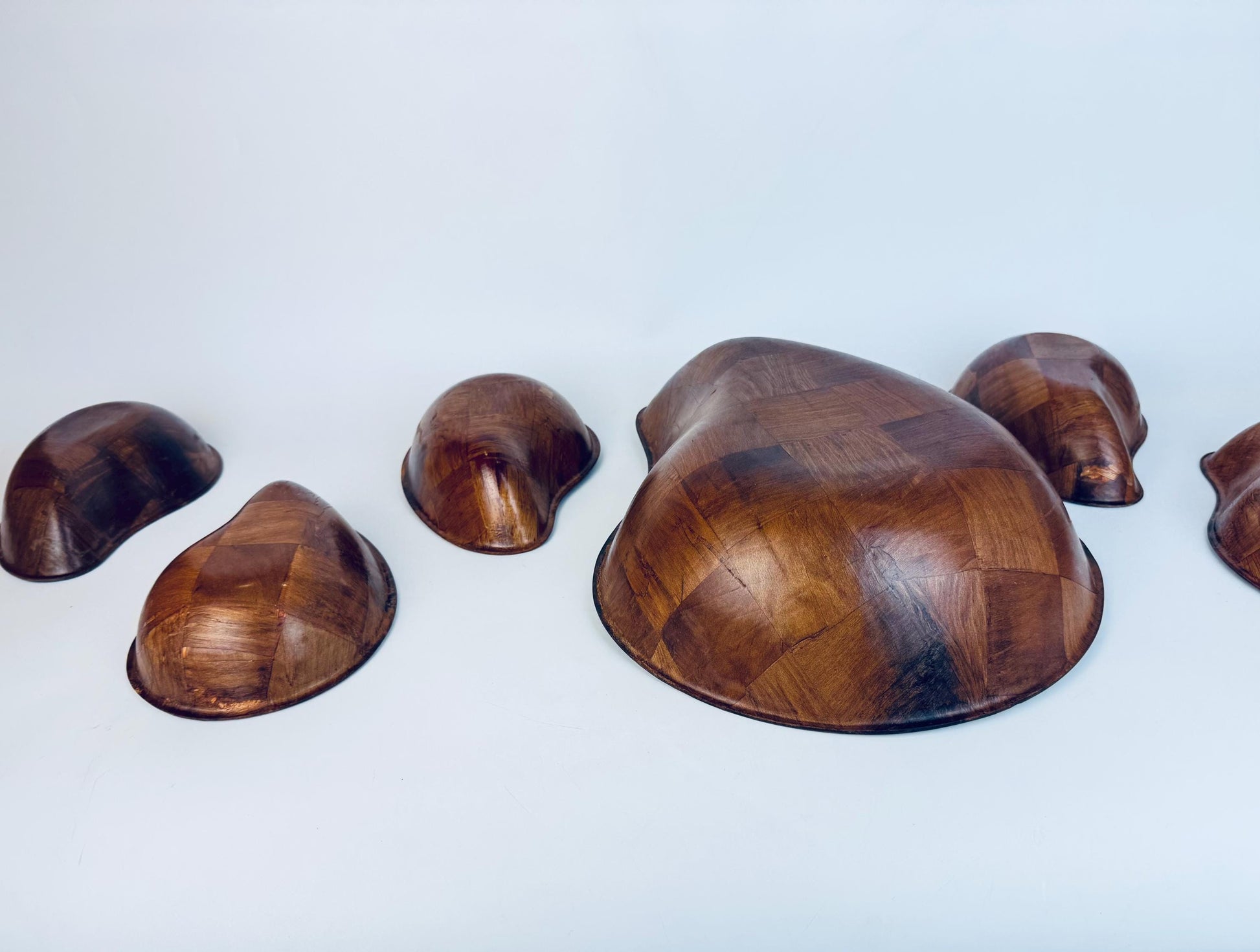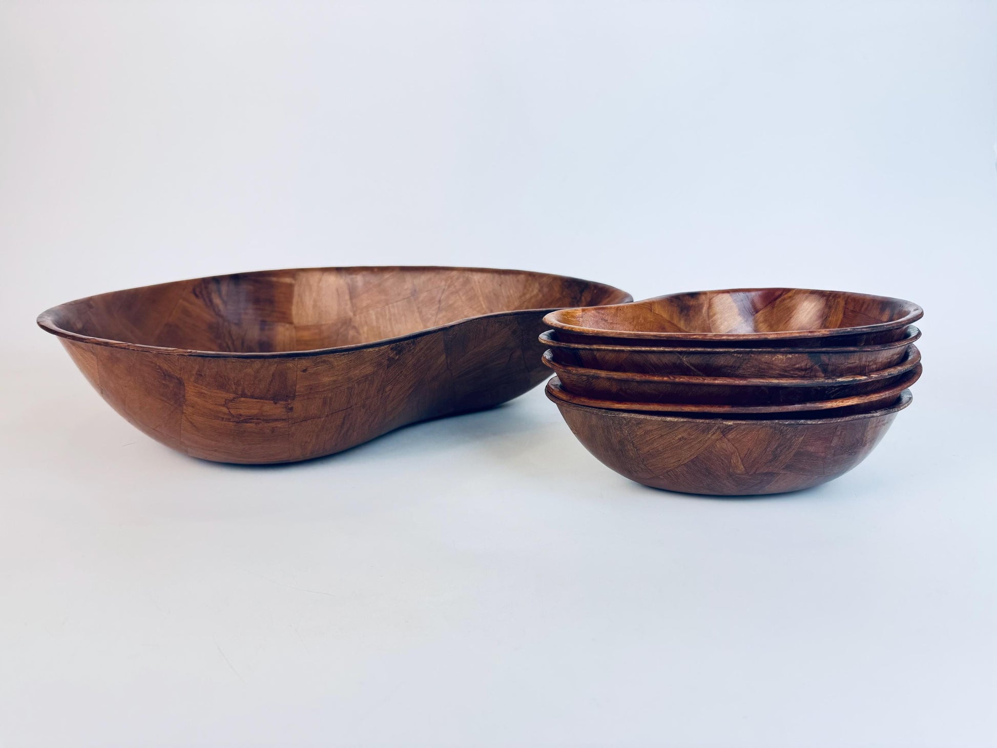 Vintage Teardrop Parquet Wooden Bowl Set 1970s-1980s Laminated Wood Serving & Salad Bowls