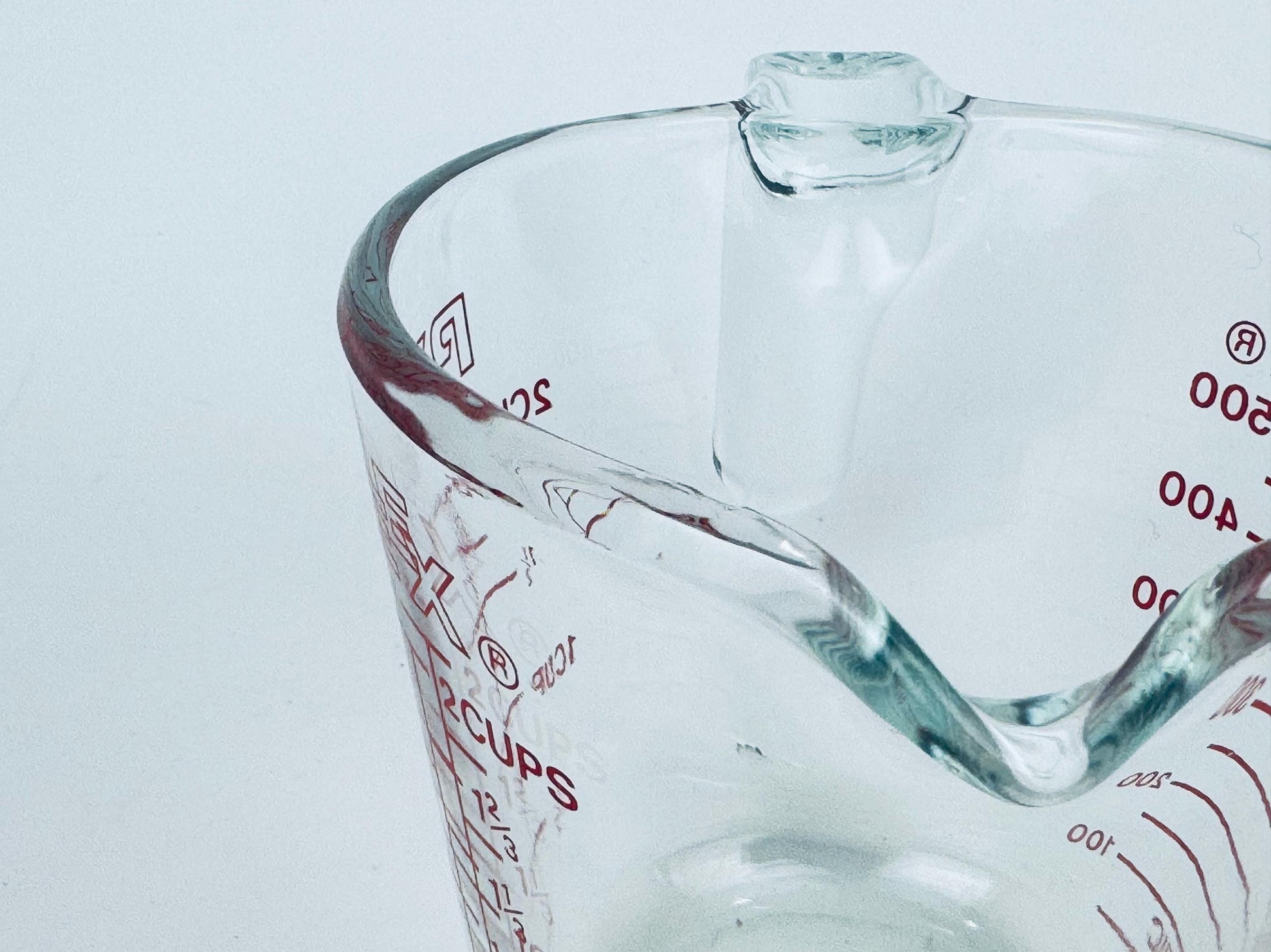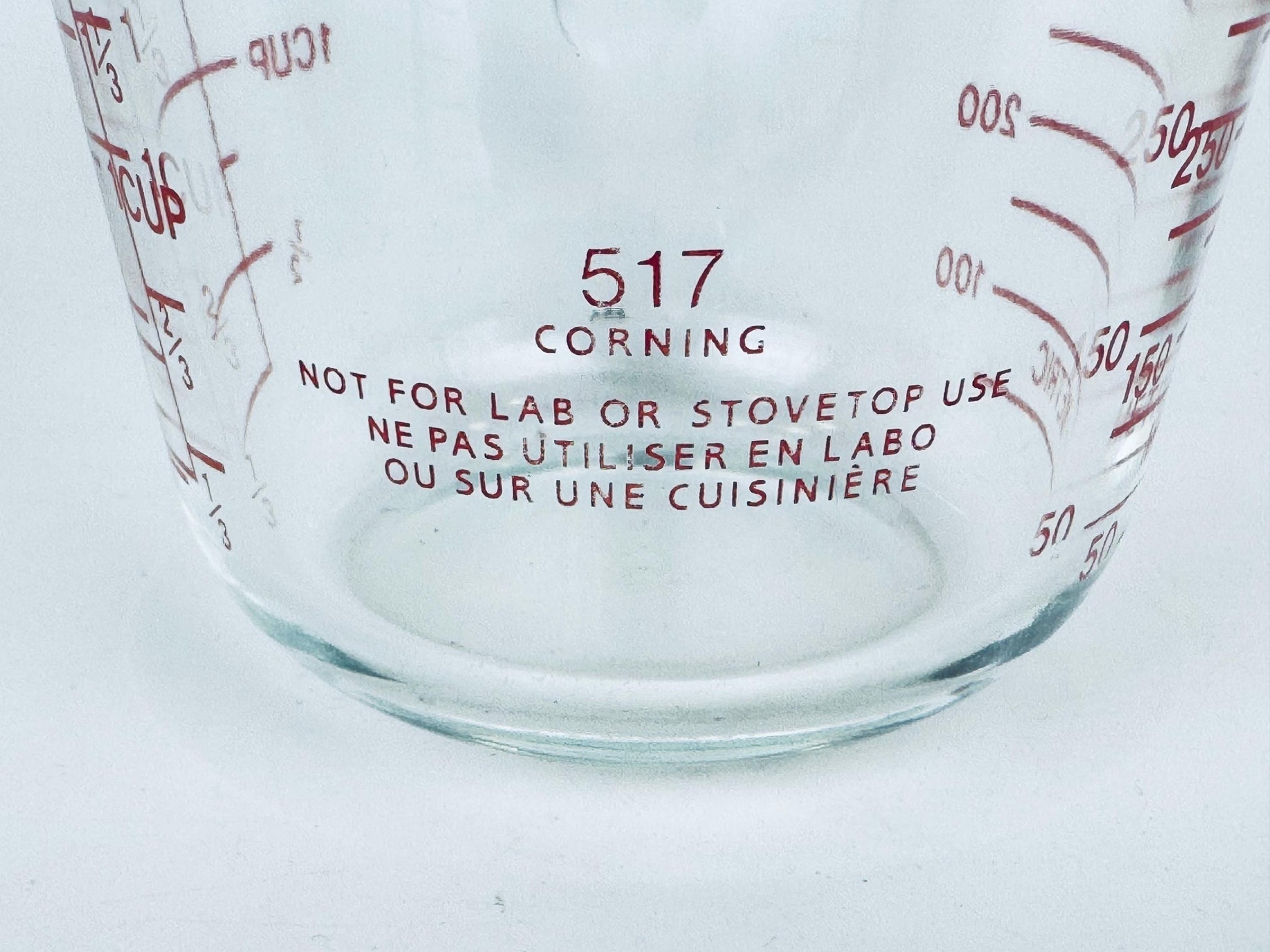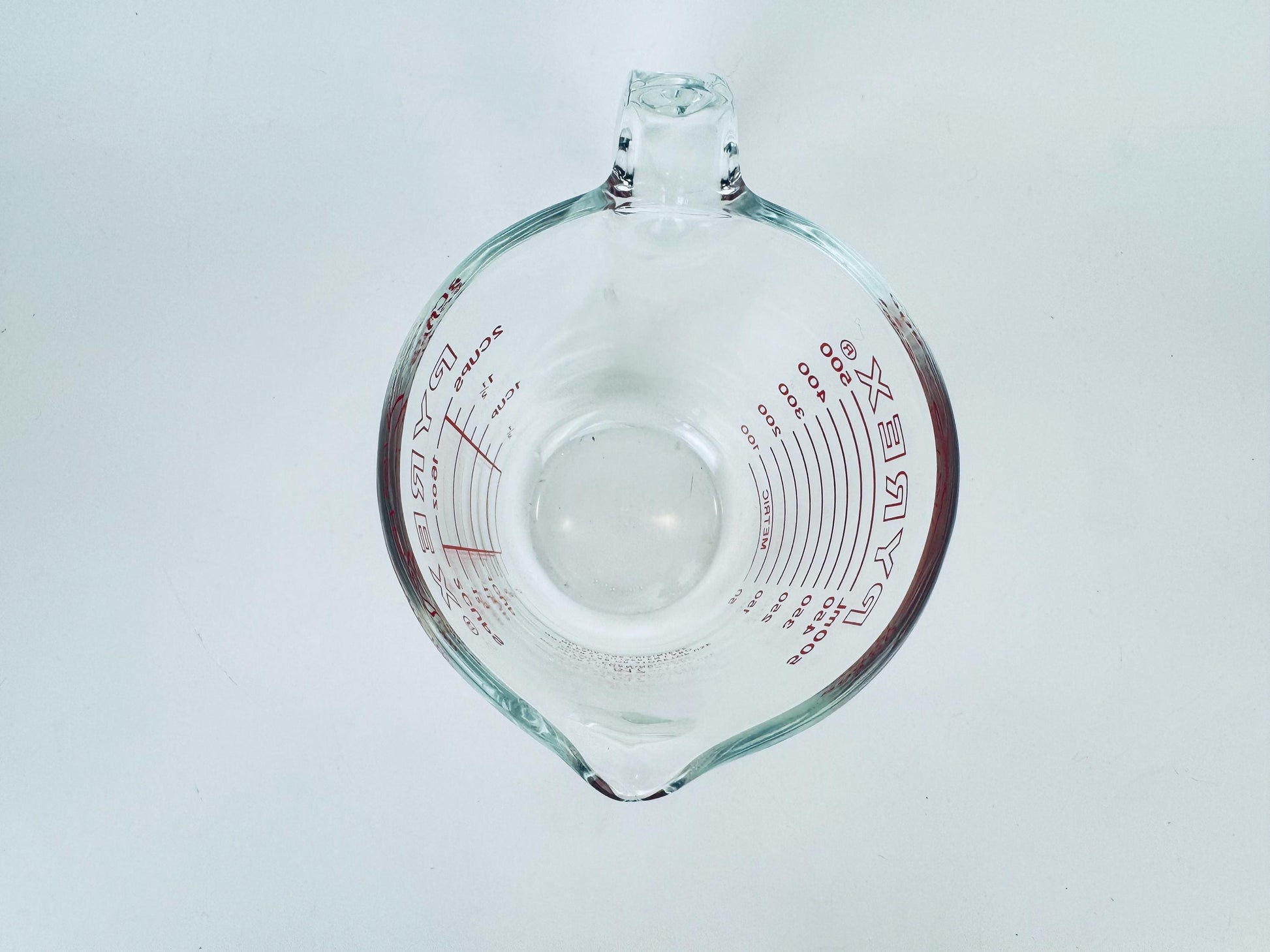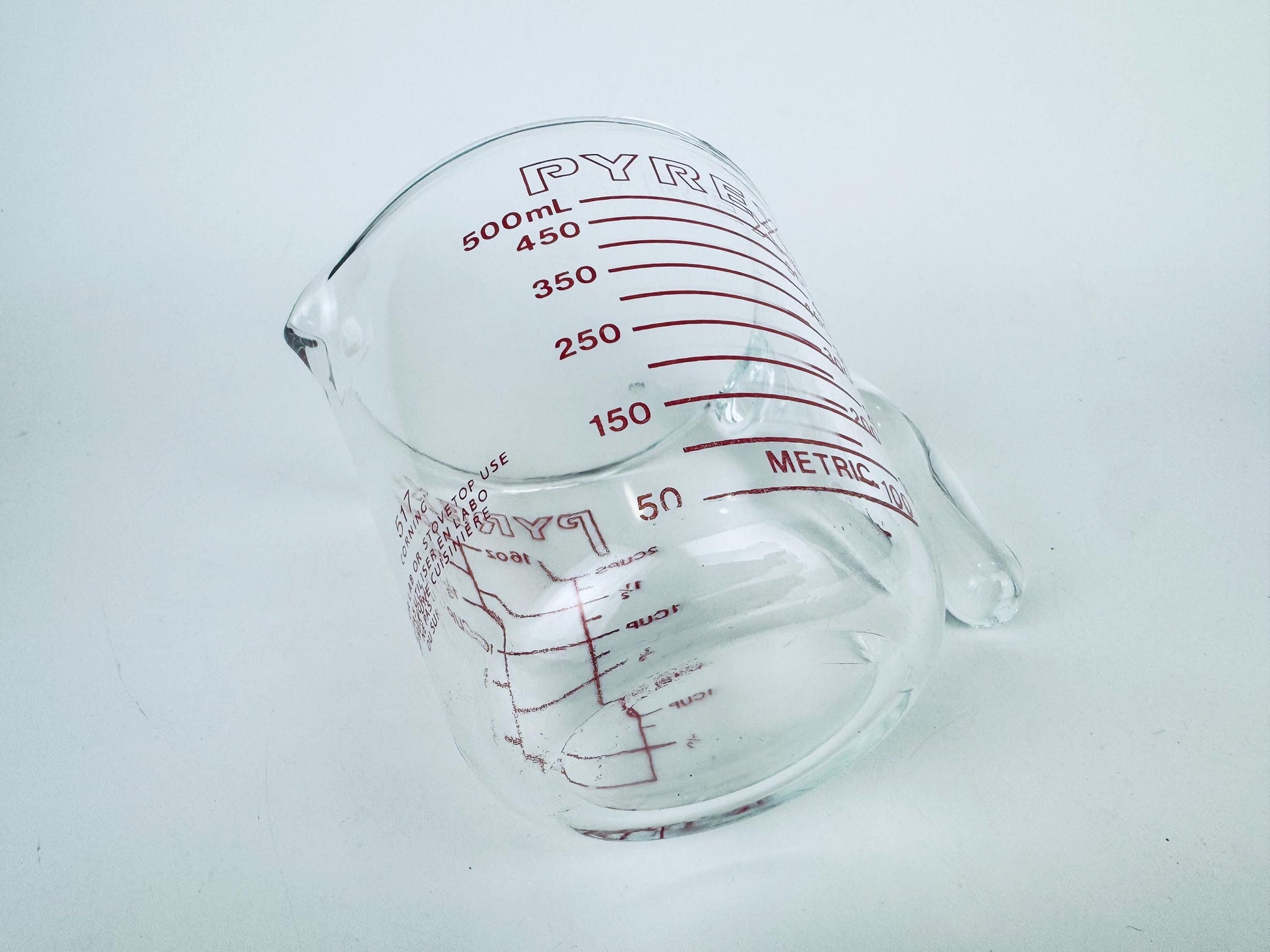 Pyrex, first introduced by Corning Glass Works in 1915, became a staple of American households thanks to its heat-resistant borosilicate glass. By the 1970s the company had streamlined production of clear glass measuring cups — the addition of metric markings in this era helps date this piece to that decade.