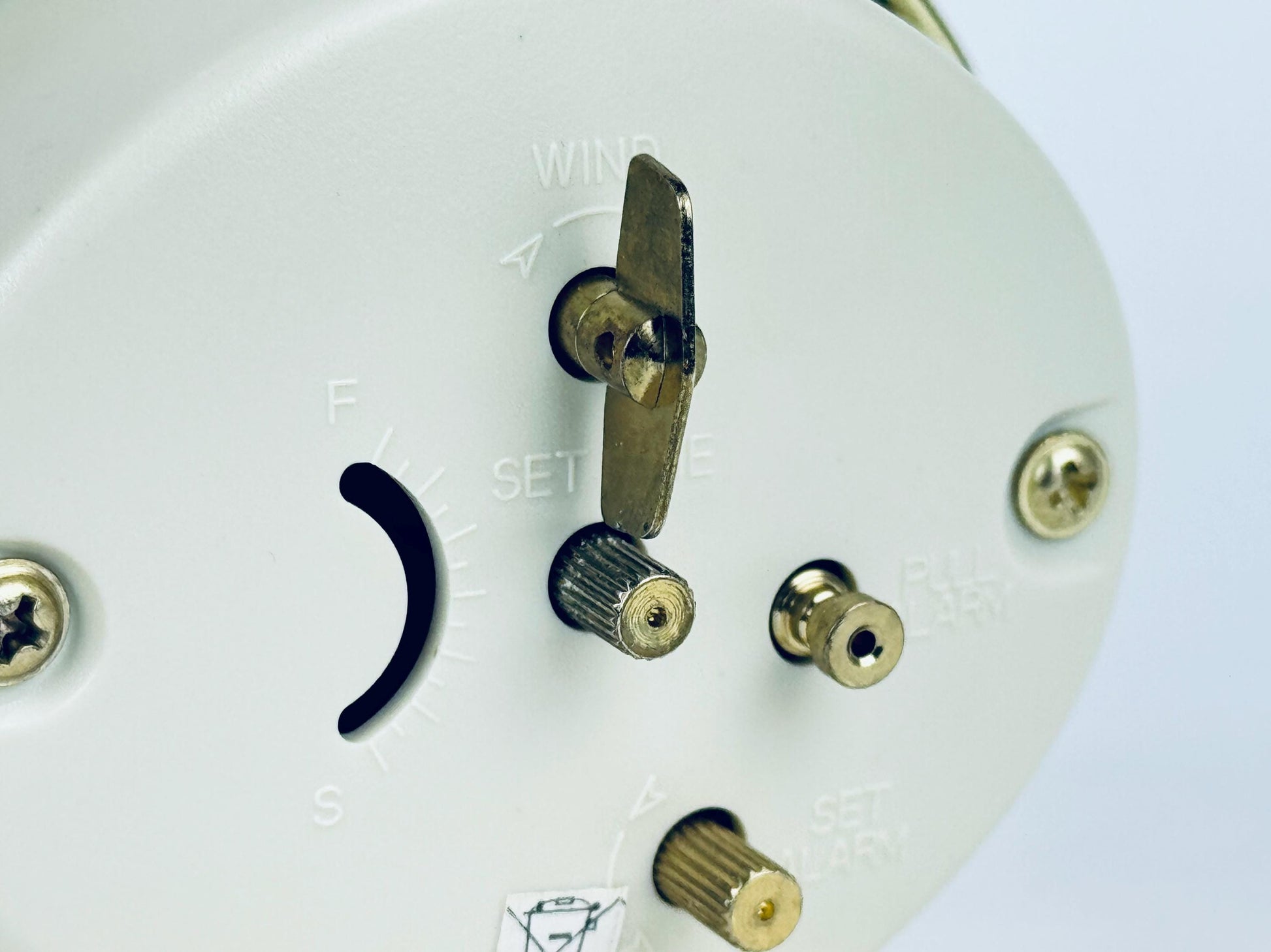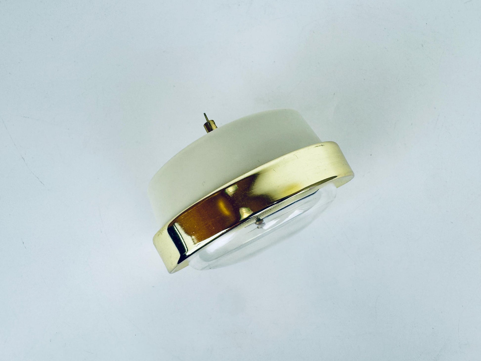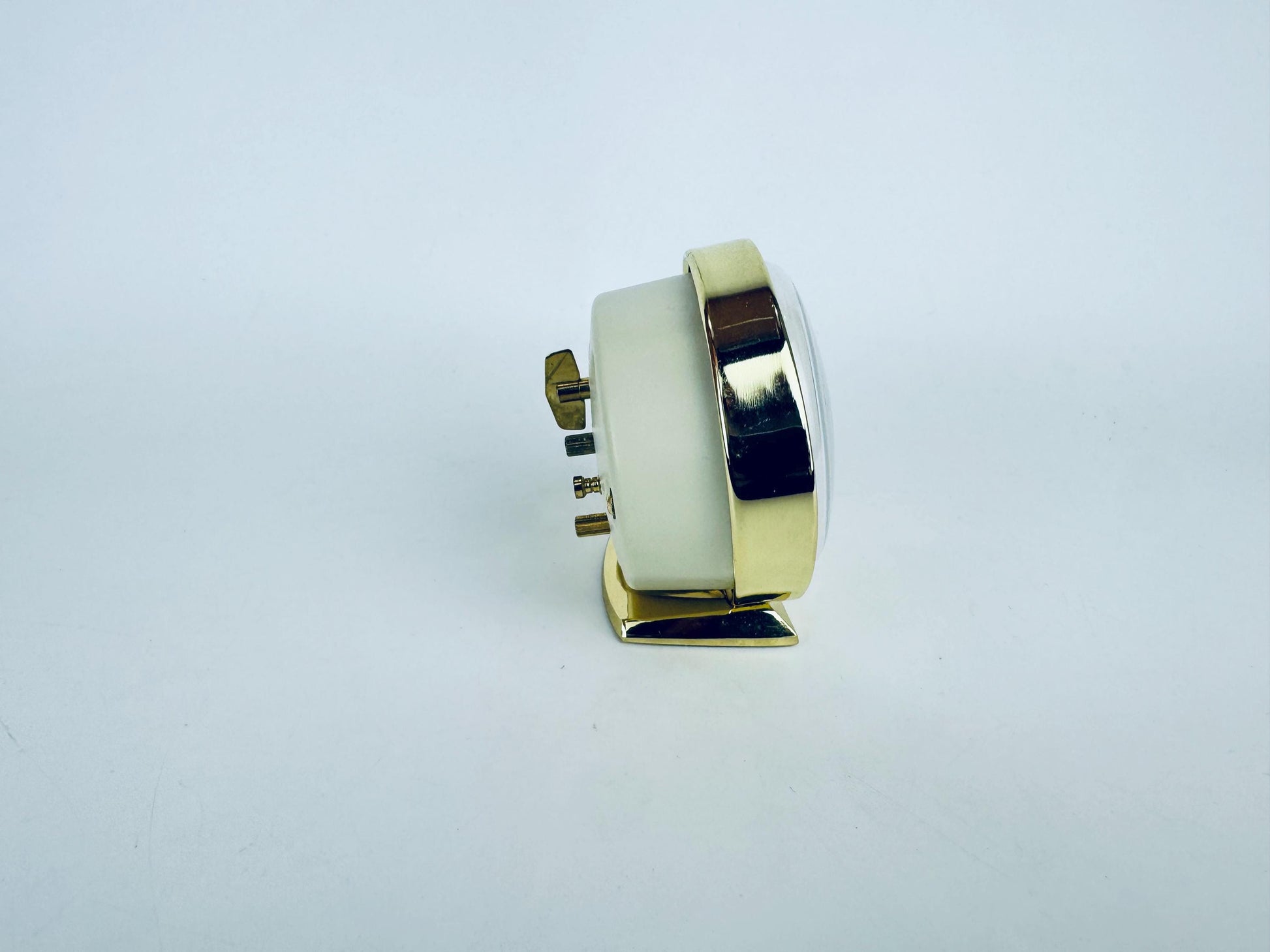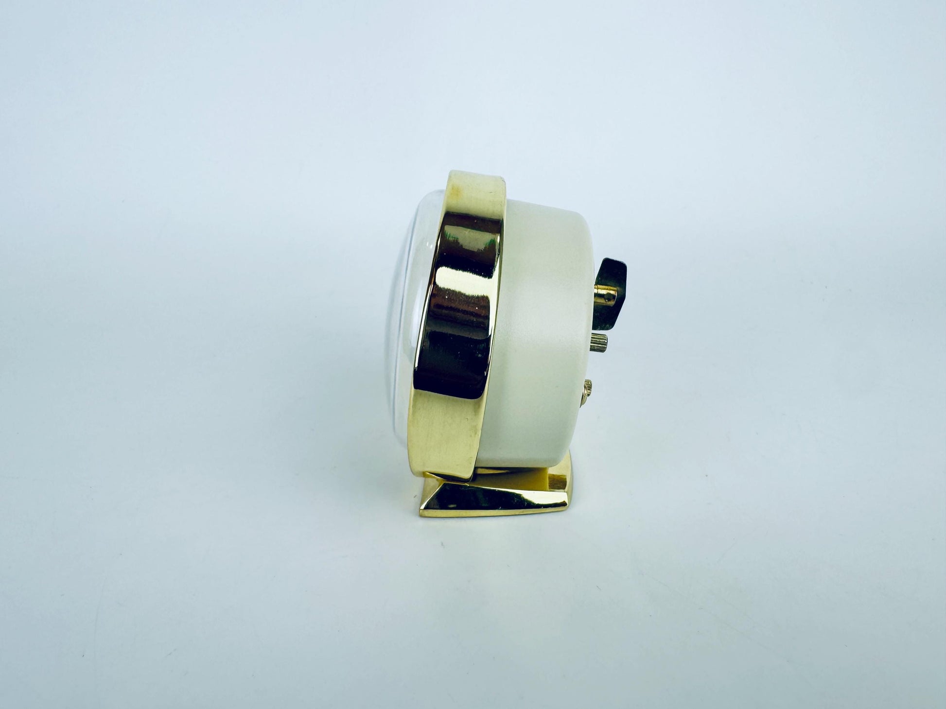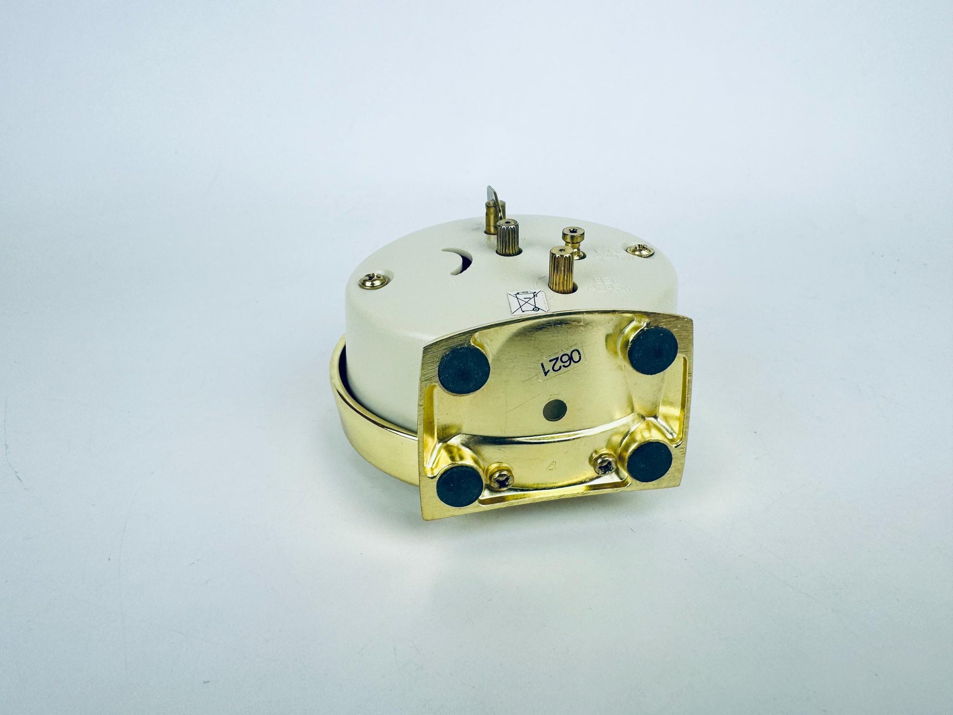 ⏰ Polished brass-tone vintage-style alarm clock with clean mid-century lines and a compact footprint — an early to mid 2000s-era desktop accent perfect for bedside, shelf, or home-office use. Sleek gold finish and bold face elevate any interior with subtle retro charm.