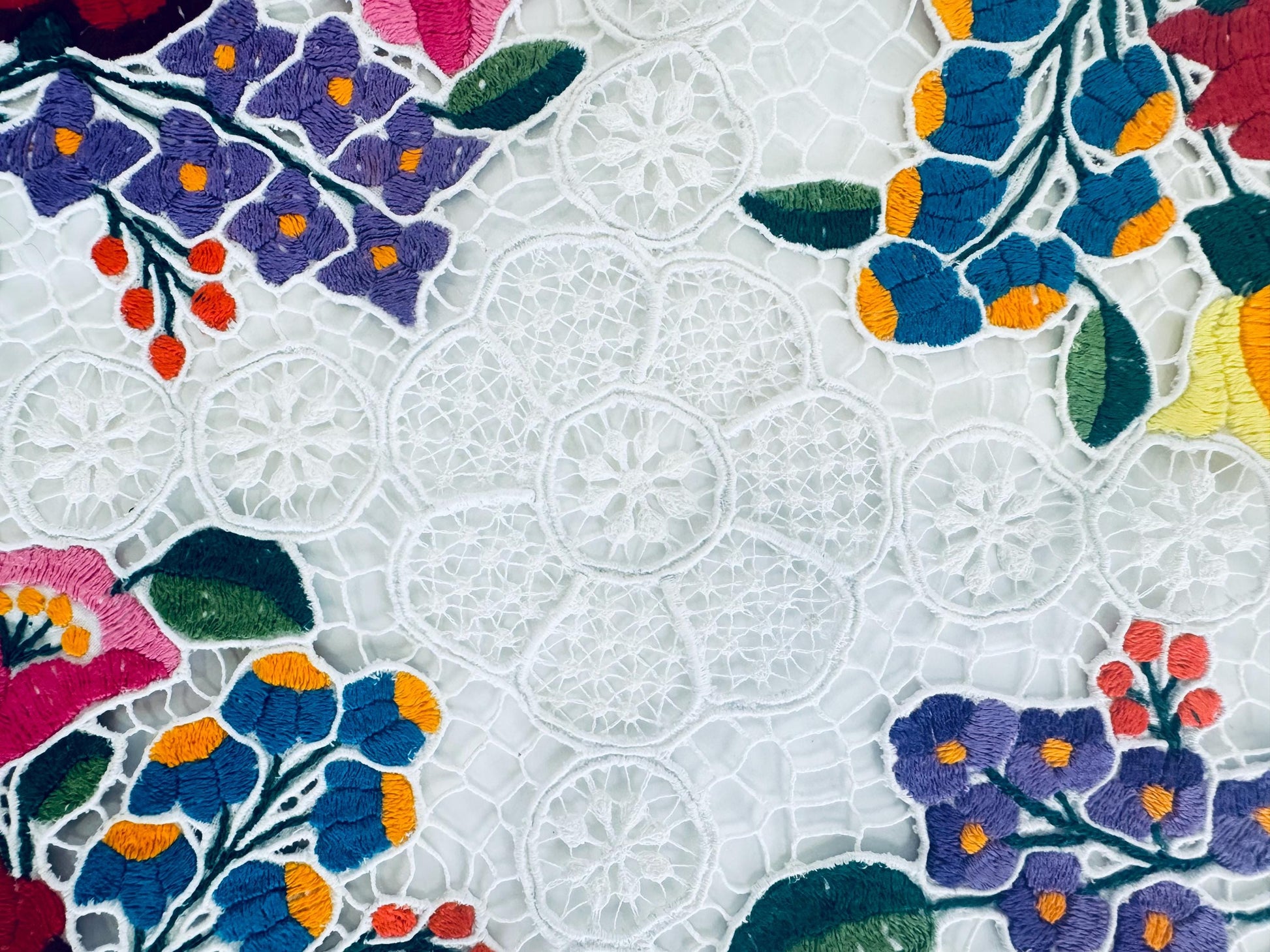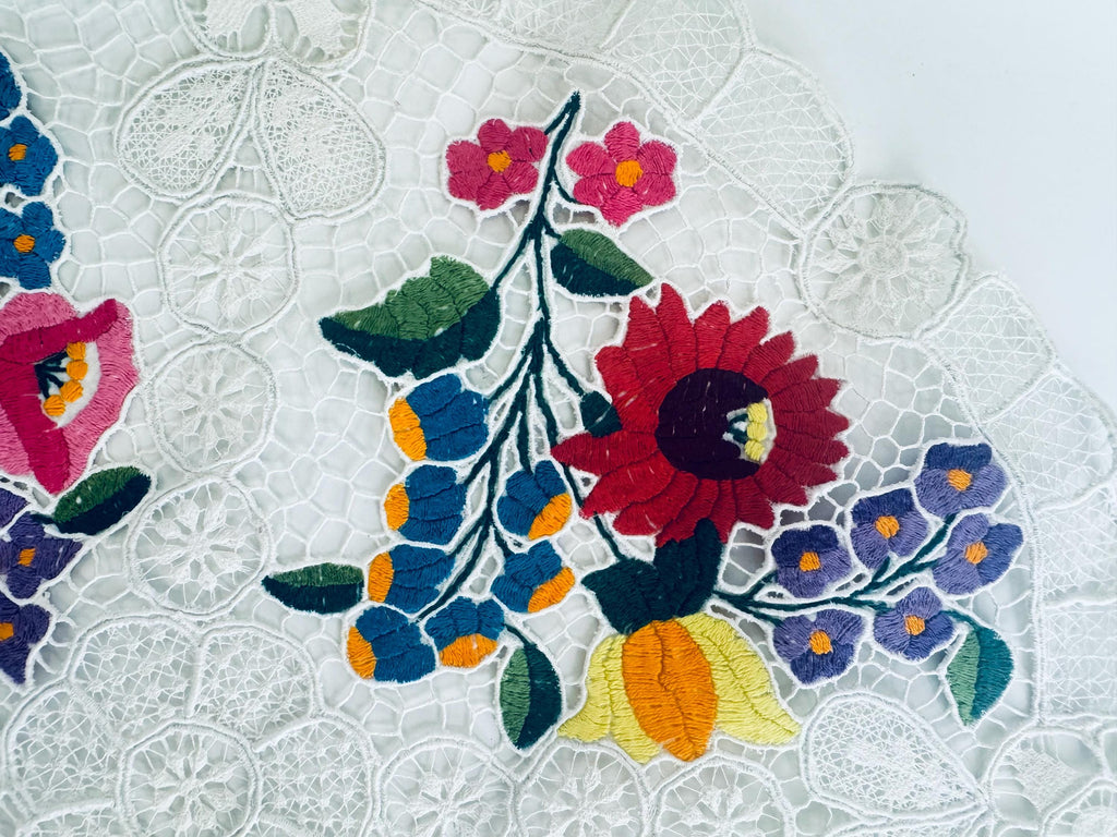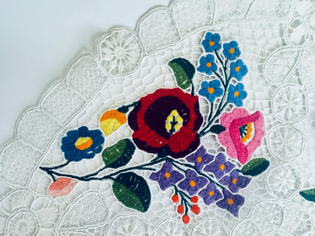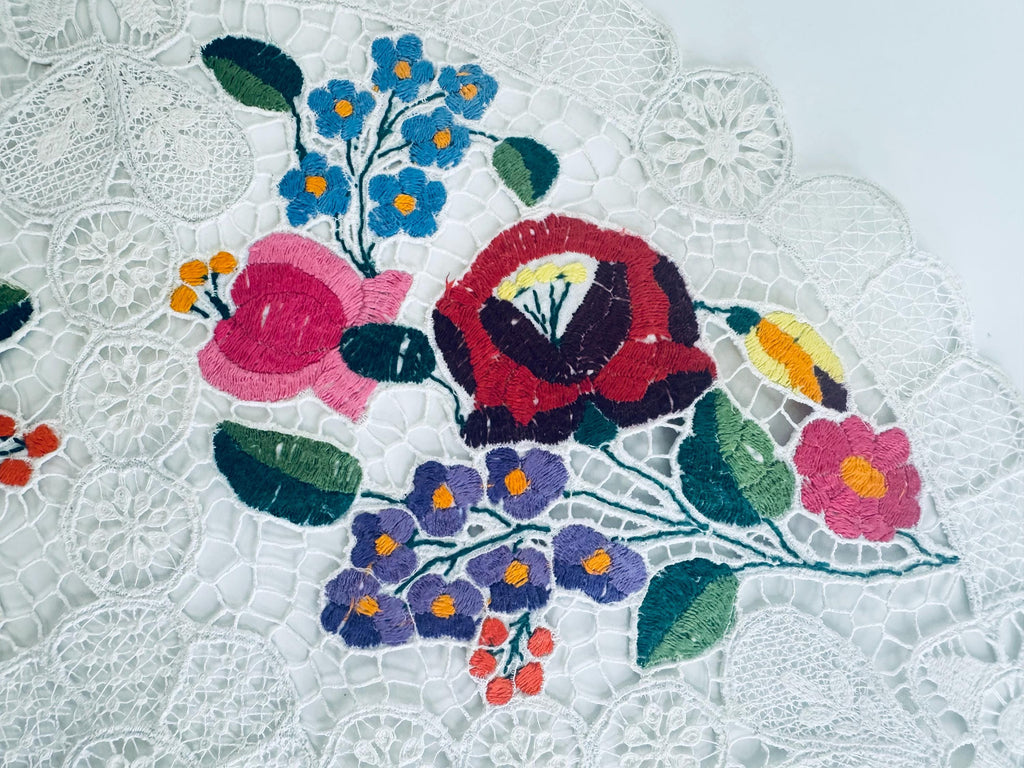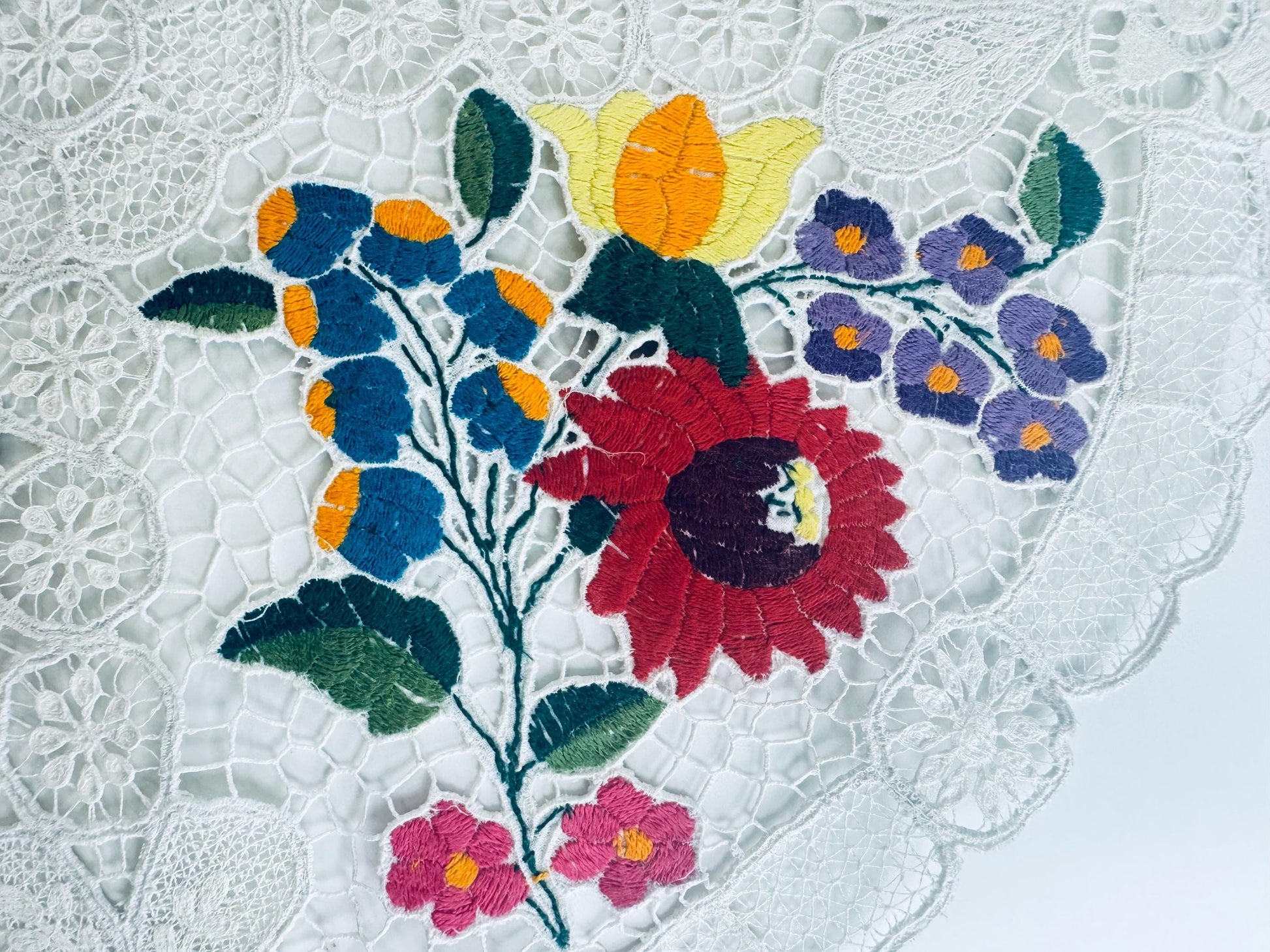đž A joyful burst of colour and craftsmanship, this large vintage round doily features richly embroidered floralsâthink crimson blooms, golden tulips, and violet sprigsâstitched onto delicate white lace. Measuring over 18 inches wide, it makes a striking centrepiece for round tables, sideboards, or layered beneath vases and serving trays. A true folk-art treasure with timeless appeal.