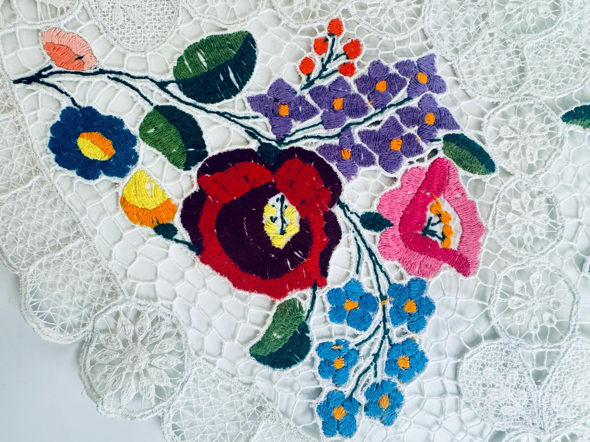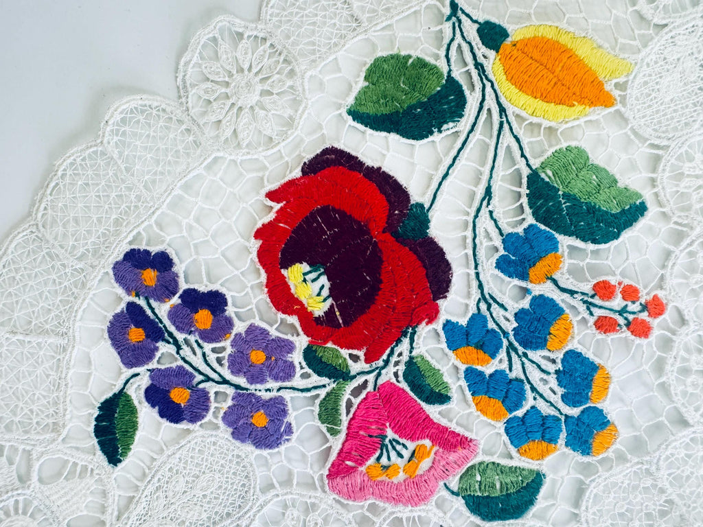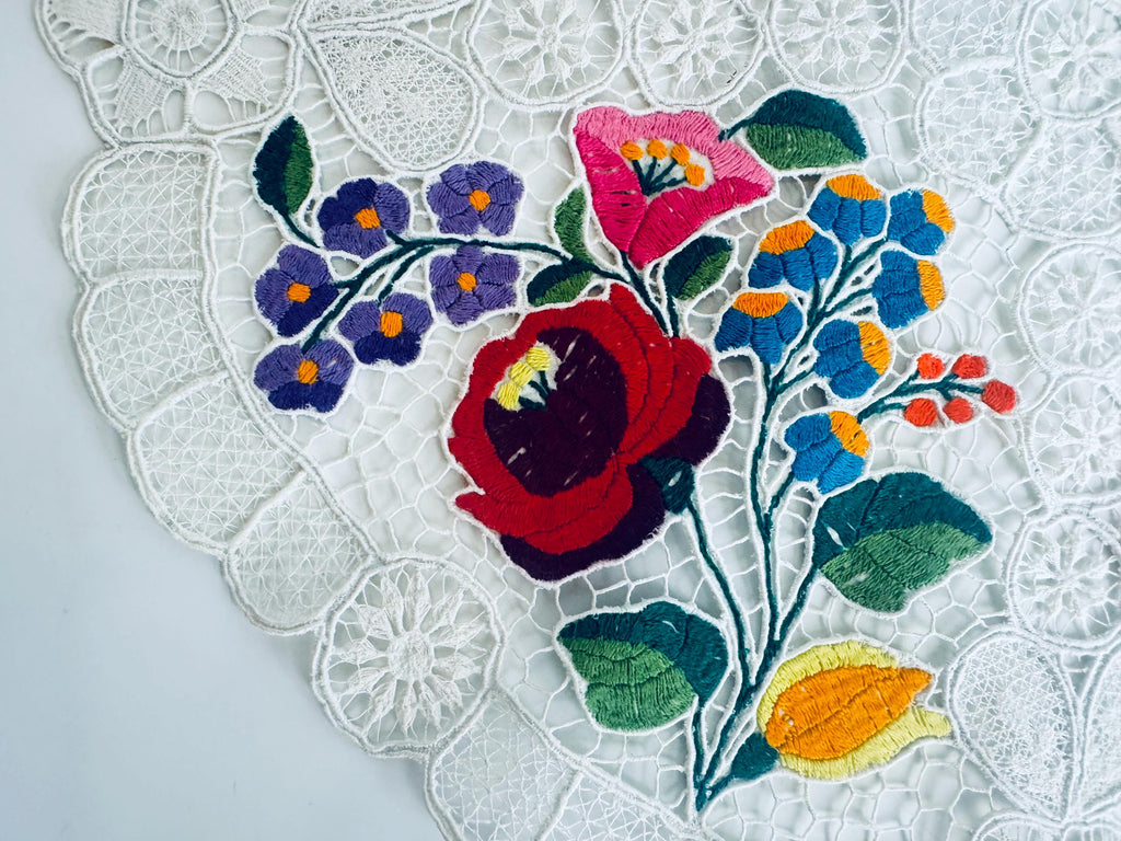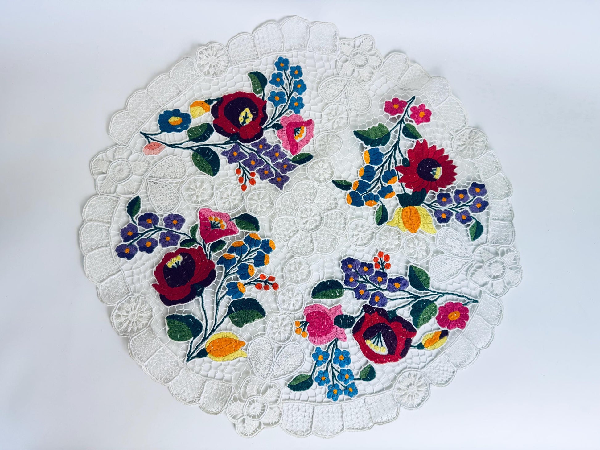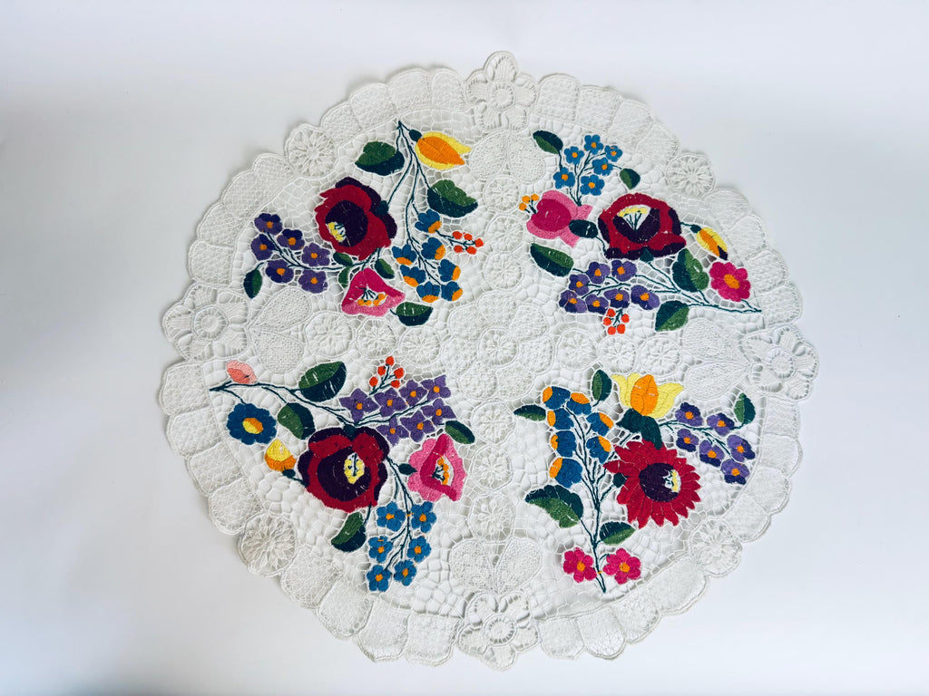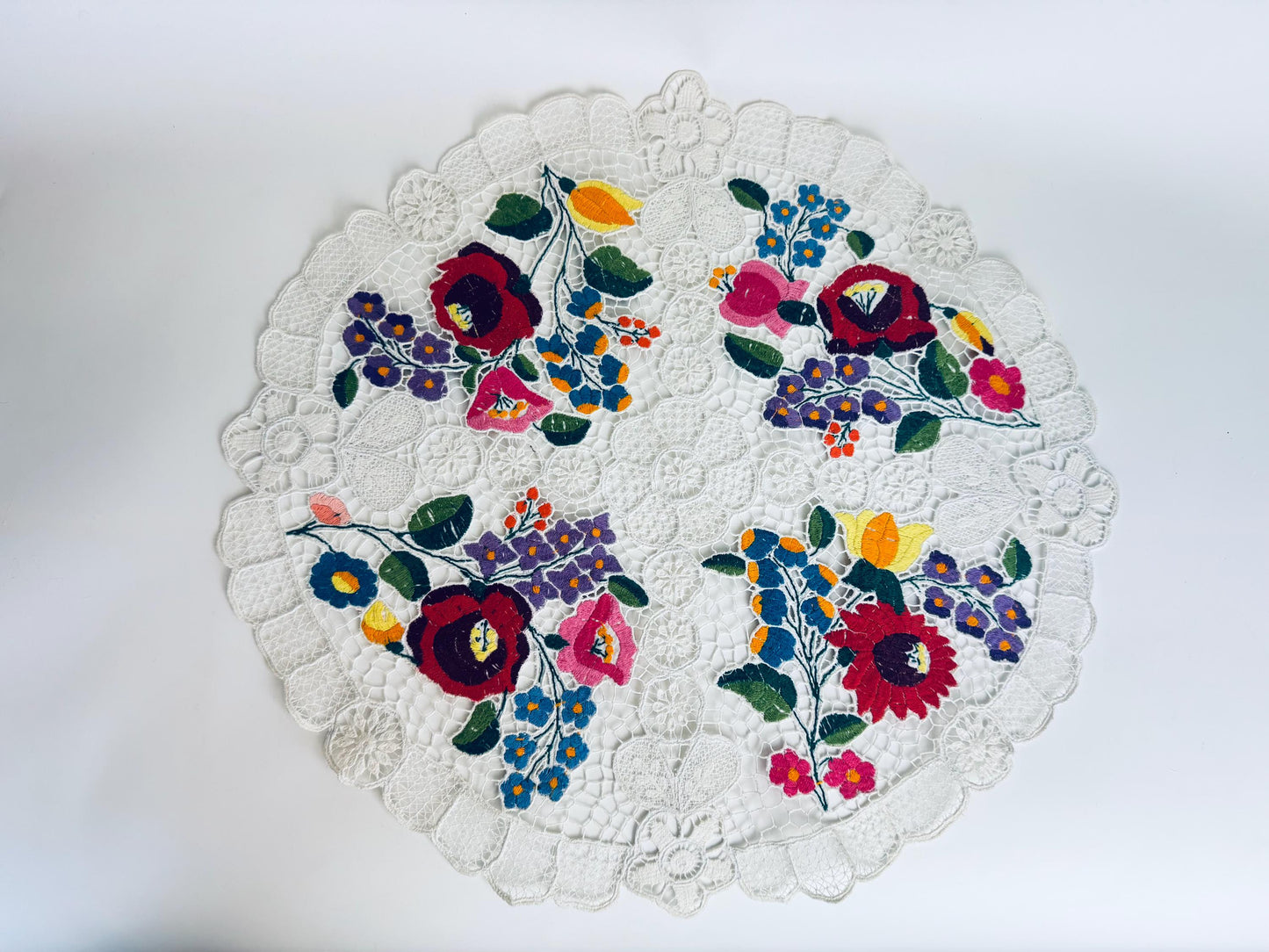 âHistory Behind The Pieceâ This piece likely hails from mid-to-late 20th century Eastern Europe, where folk embroidery traditions flourished in domestic textiles. The bold palette and tight stitching reflect regional styles from Hungary or Polandâplaces where such lace doilies were both practical and decorative heirlooms, lovingly passed down or gifted for special occasions.