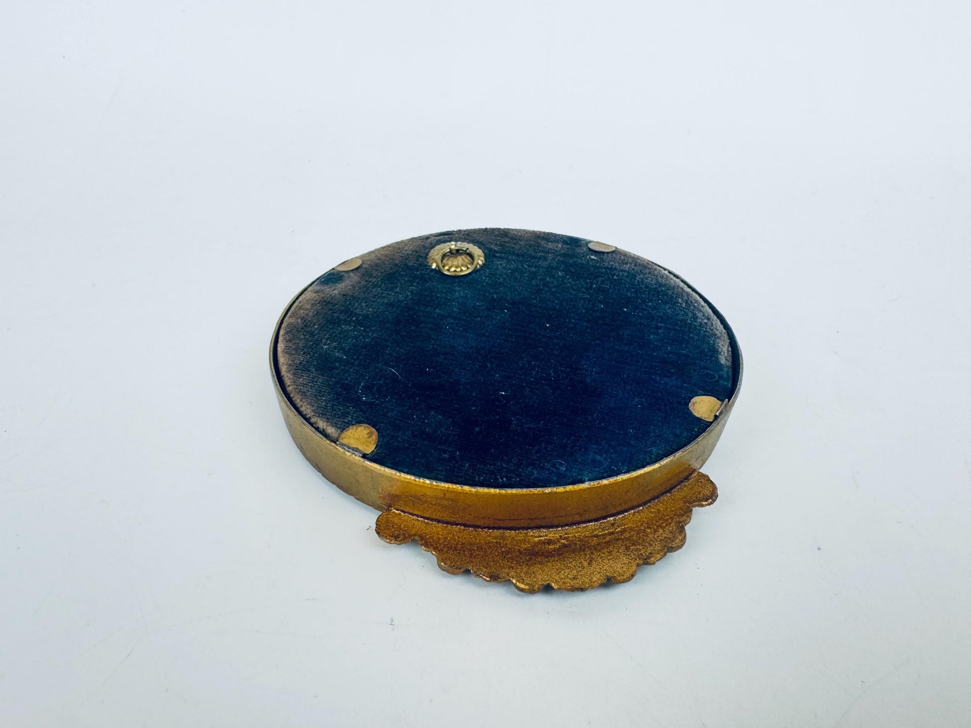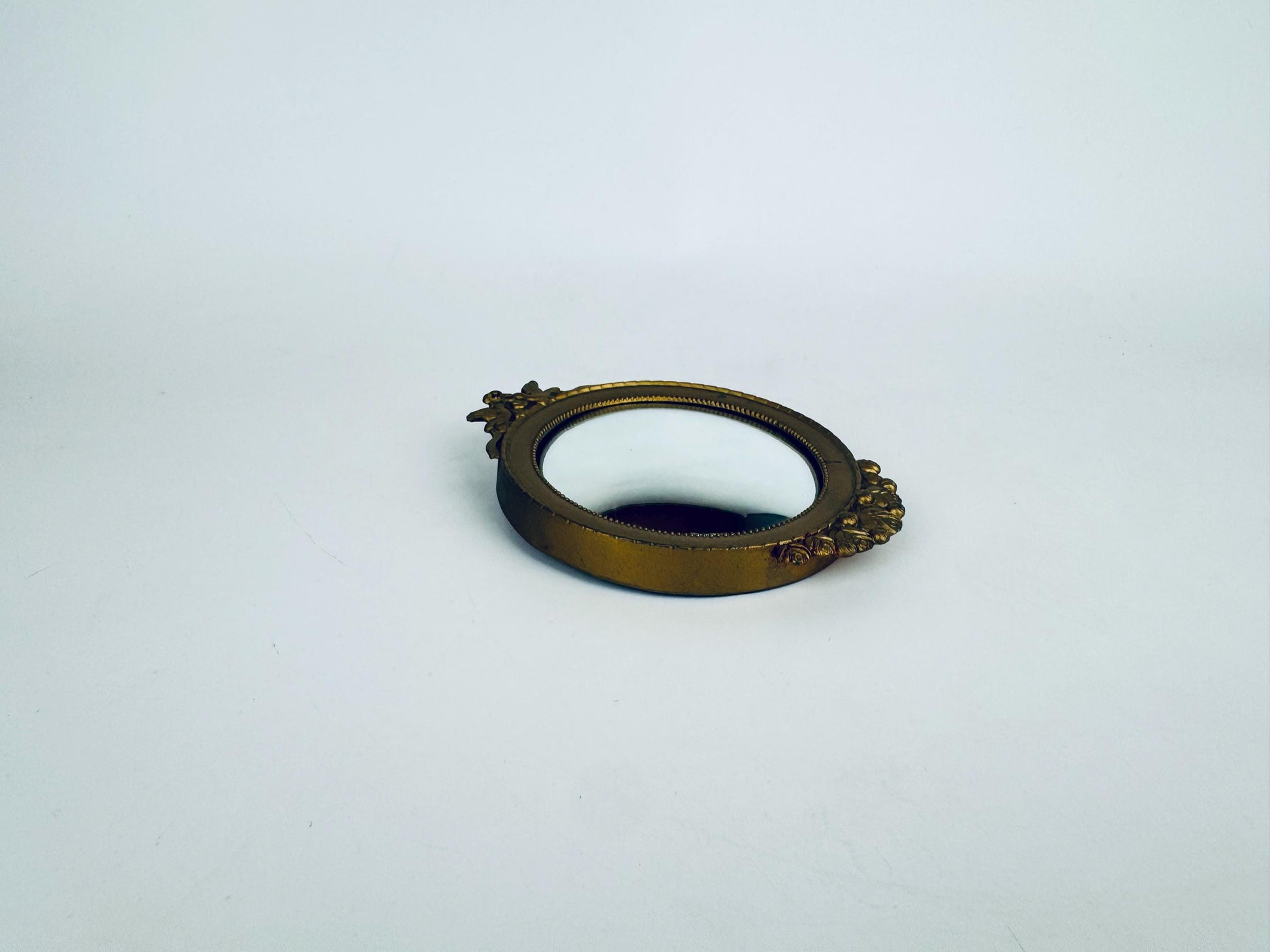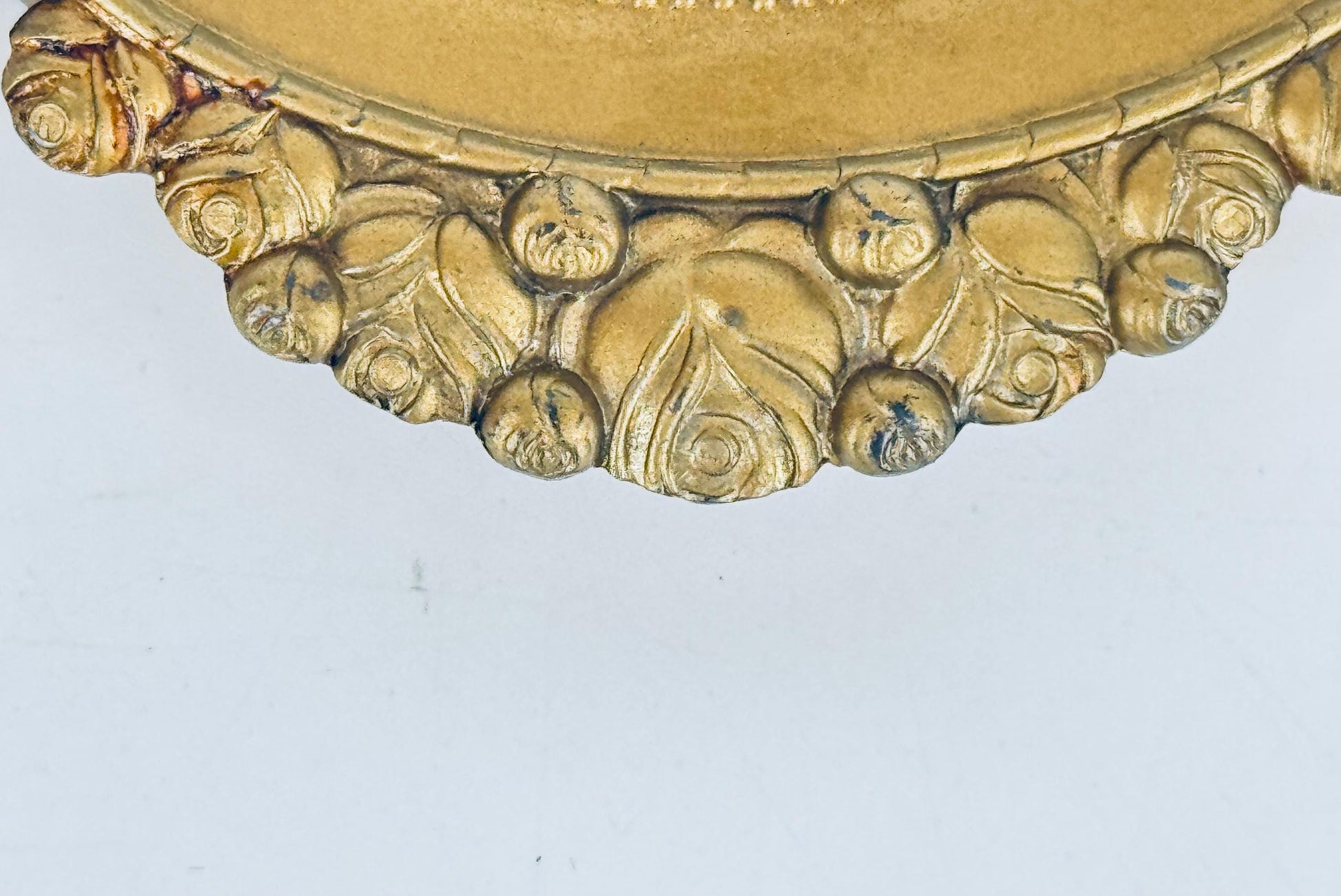 Convex mirrors—popularized in the Regency and Federal periods—experienced a renaissance during the mid-20th century as decorators revived neoclassical motifs in smaller decorative formats. This brass example reflects that 1960s revival, blending traditional ornamentation with the clean, compact proportions prized in Hollywood Regency interiors.
