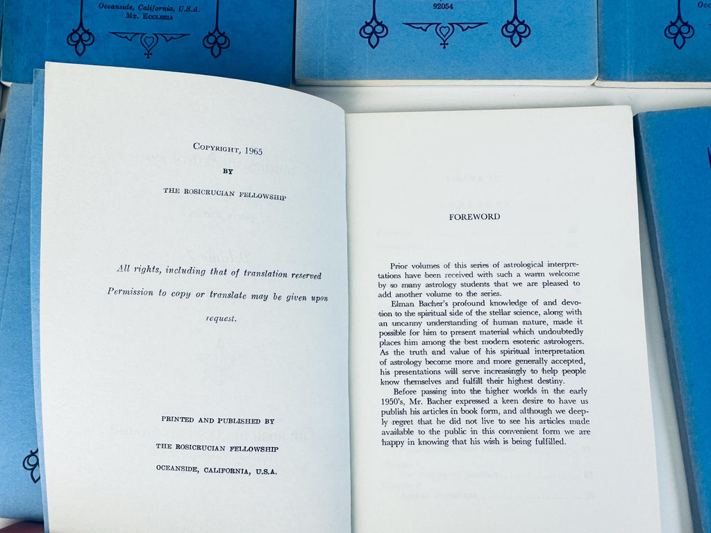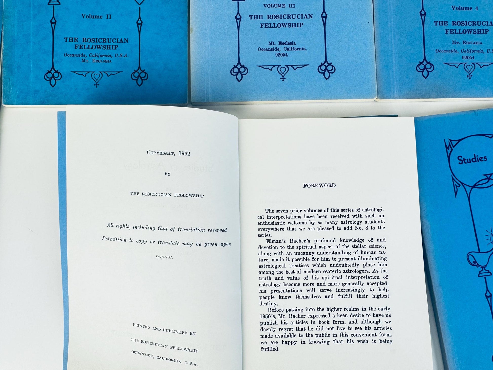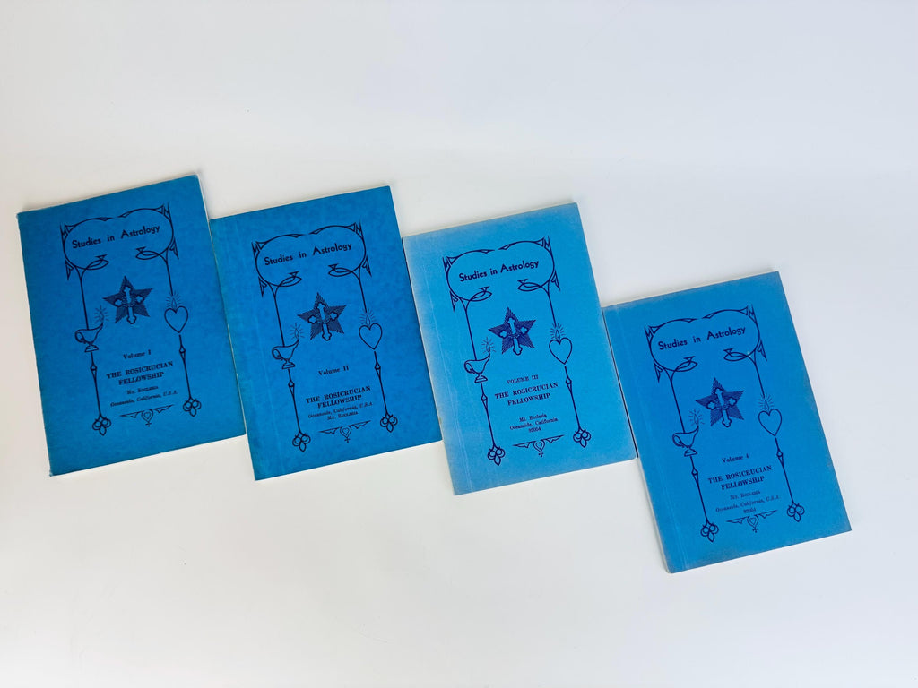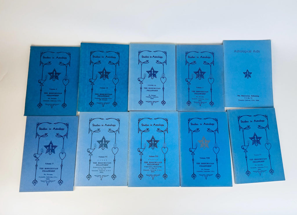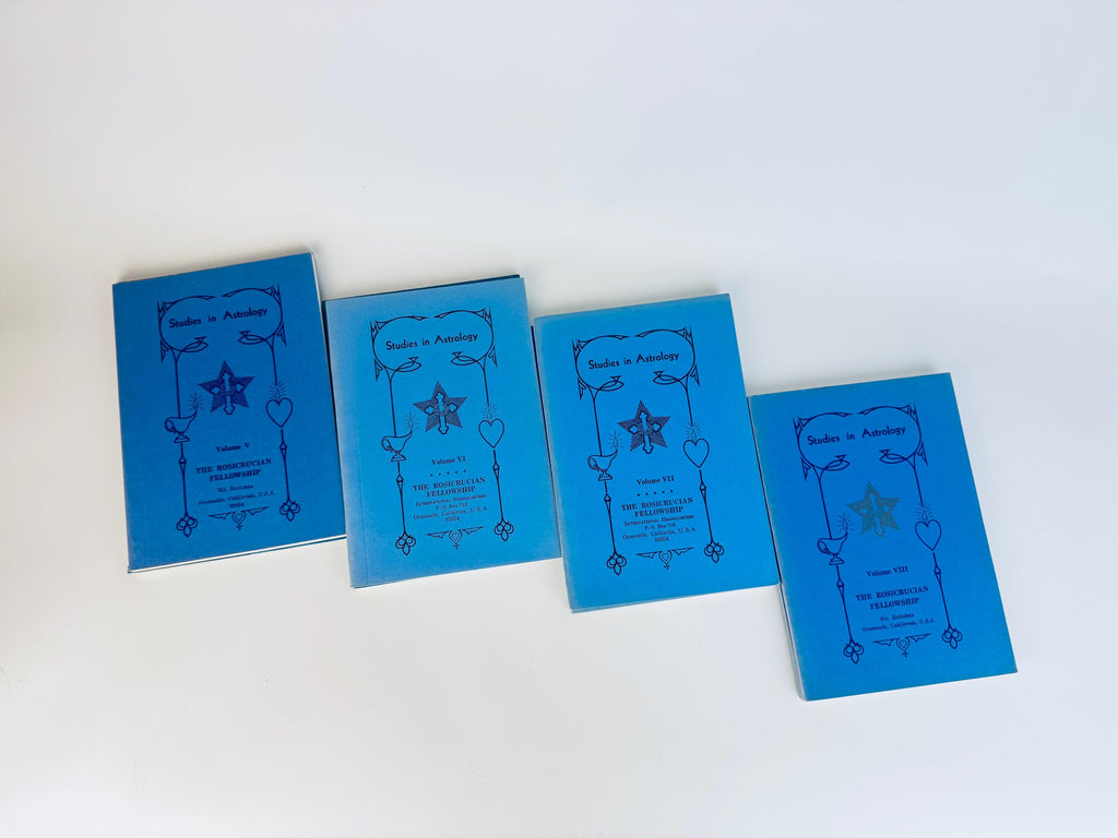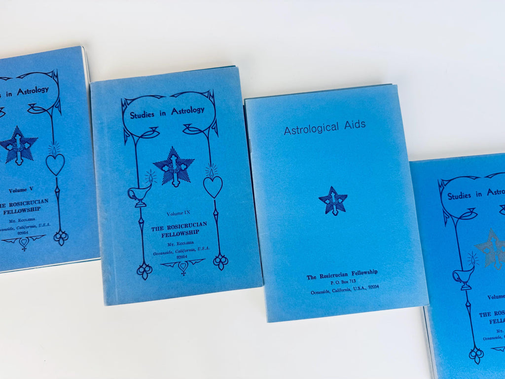 đź A remarkable collection of vintage astrology texts published by The Rosicrucian Fellowship in Oceanside, California during the 1960s. Offered here are individual softcover volumes from the Studies in Astrology series (Volumes I through IX) along with the companion Astrological Aids. Bound in signature cobalt-blue covers with mystical motifs, each booklet blends esoteric wisdom with mid-century design, making them equally suited for study, collecting, or display.