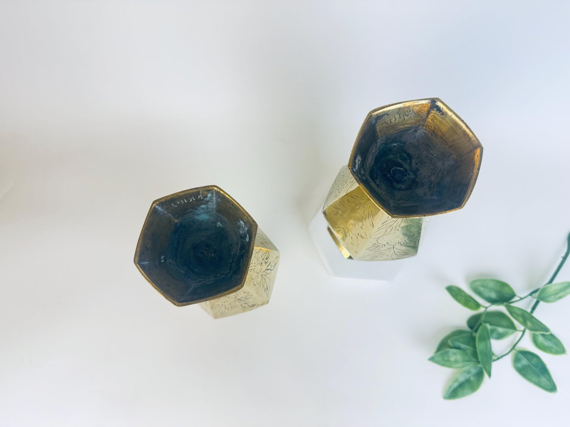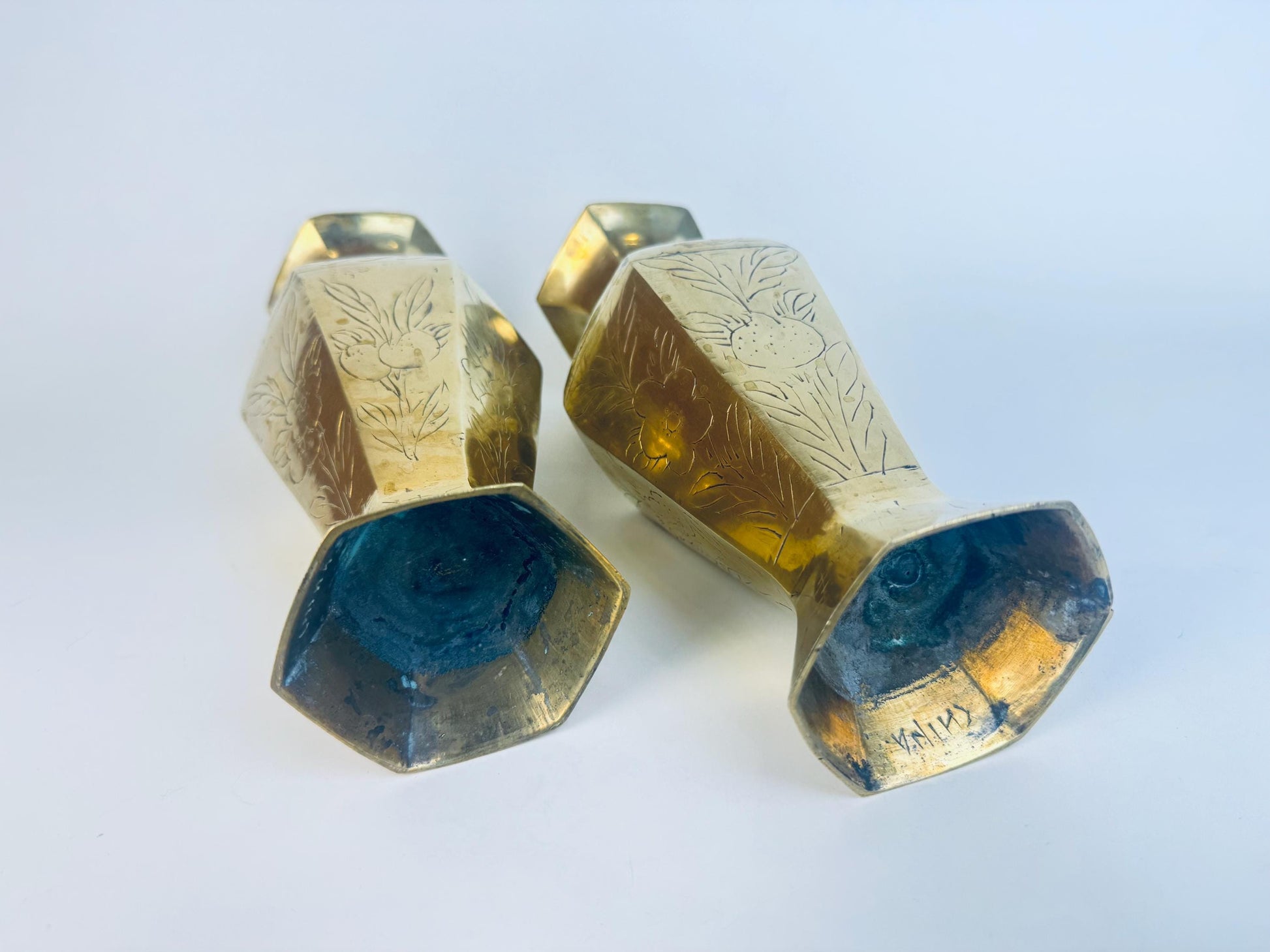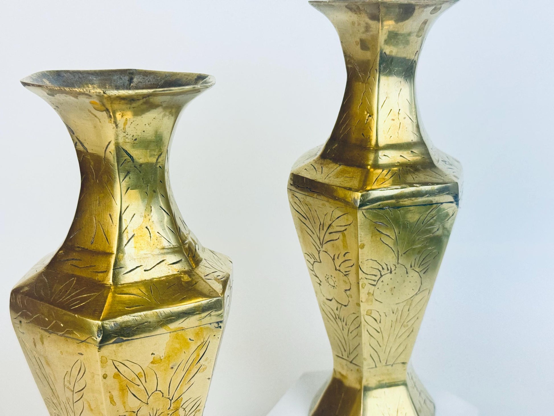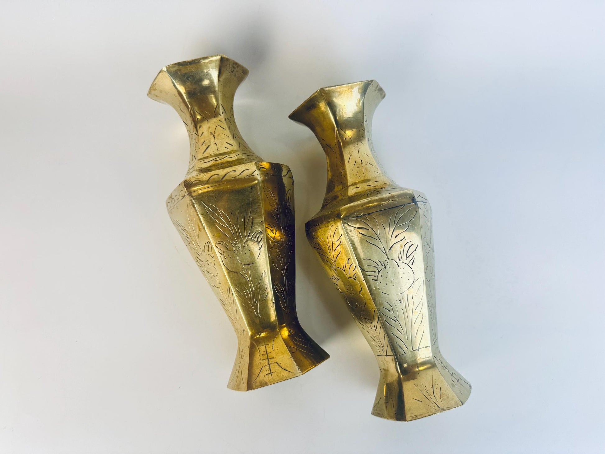 🌿 🟡 Gracefully weighted and richly detailed, this vintage pair of solid brass vases offers timeless symmetry for a mantel, console, or sideboard. Each stands approximately 9.3” high, marked Made in China, and hand-etched with delicate floral and leaf motifs along hexagonal forms that reflect soft golden light. Their substantial combined weight of 1.27 kg (1.81 lbs) lends a grounded, architectural quality ideal for fireplace styling, bookshelf balance, or centrepiece display.