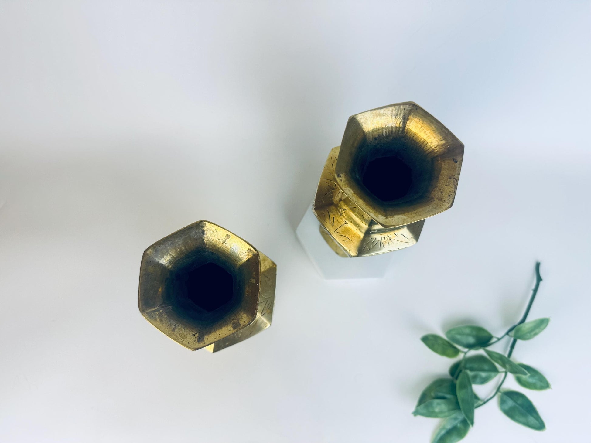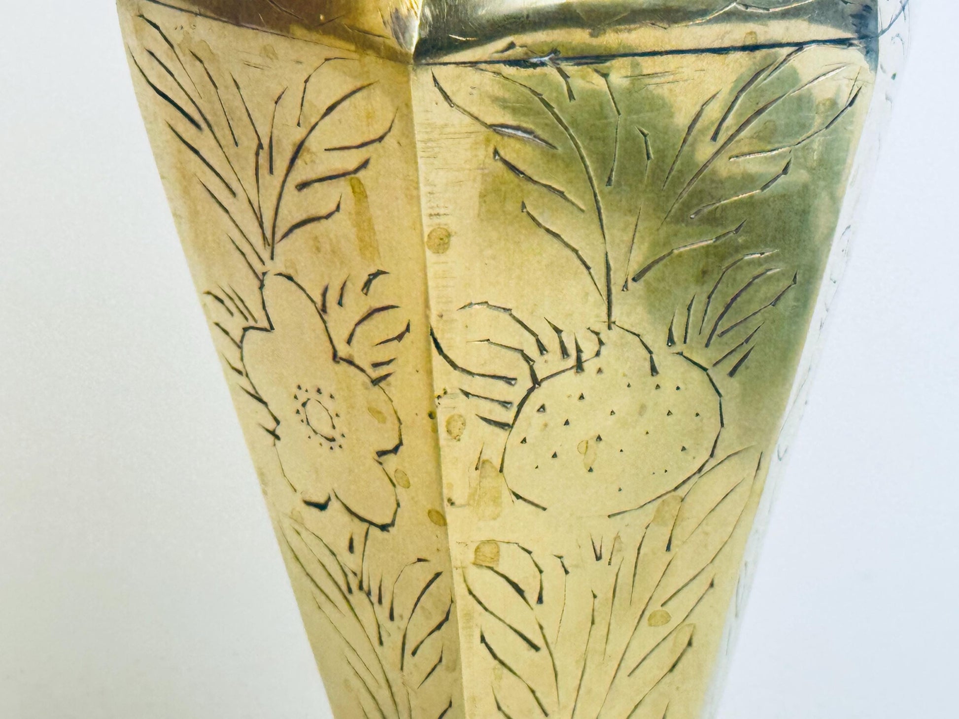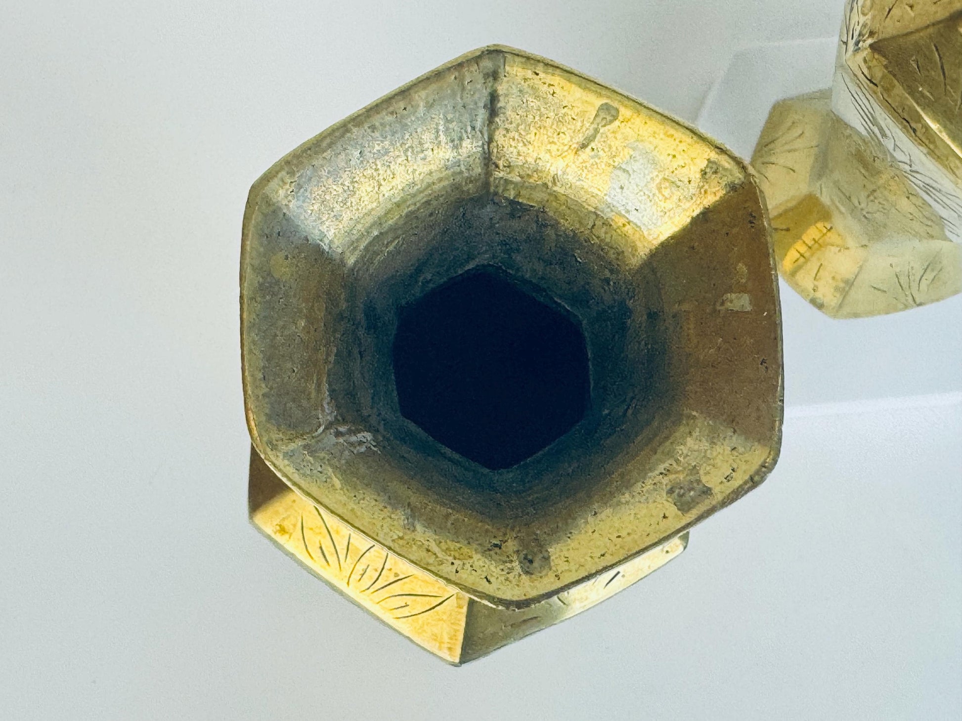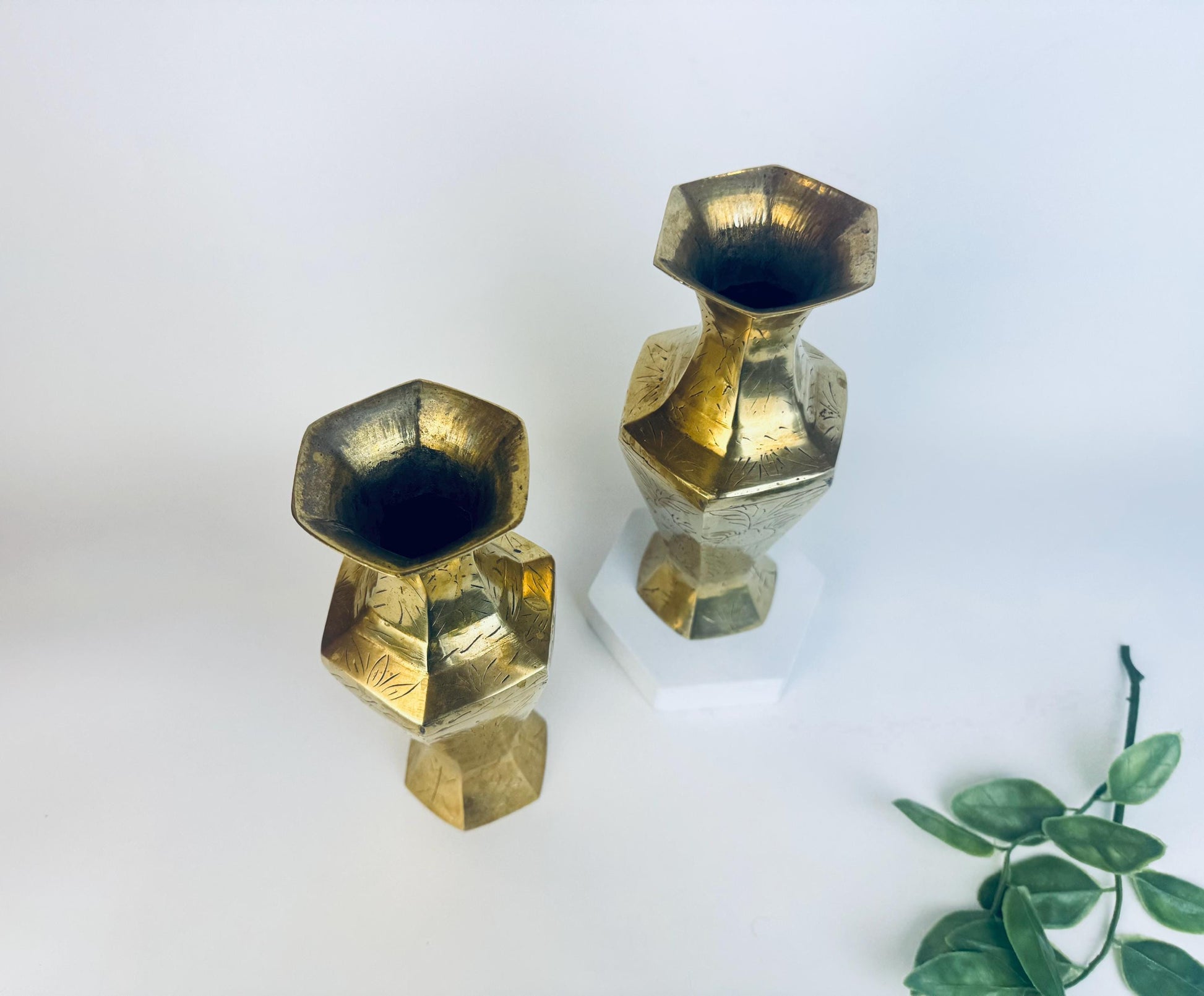 🌿 🟡 Gracefully weighted and richly detailed, this vintage pair of solid brass vases offers timeless symmetry for a mantel, console, or sideboard. Each stands approximately 9.3” high, marked Made in China, and hand-etched with delicate floral and leaf motifs along hexagonal forms that reflect soft golden light. Their substantial combined weight of 1.27 kg (1.81 lbs) lends a grounded, architectural quality ideal for fireplace styling, bookshelf balance, or centrepiece display.