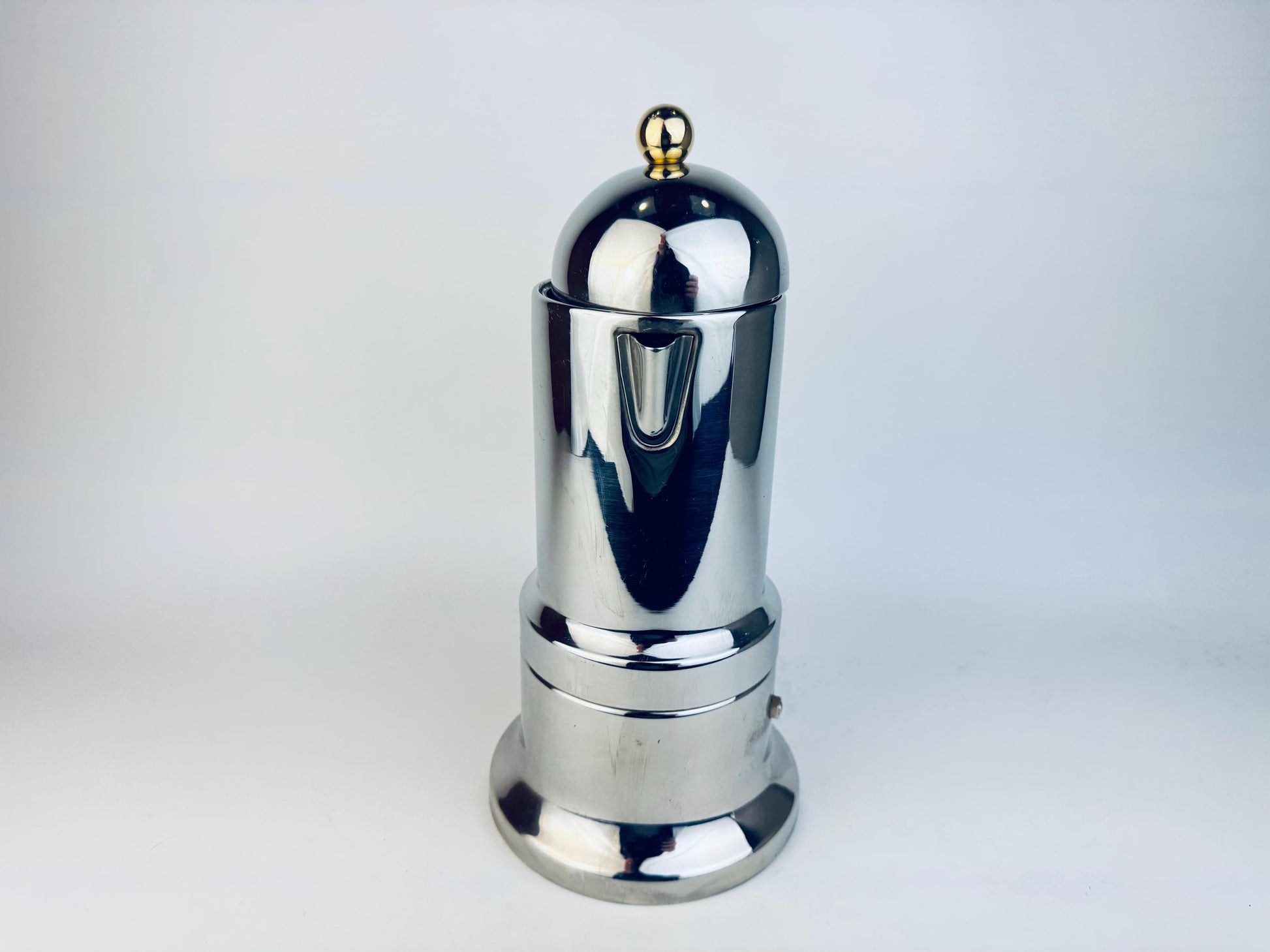 ☕ Elegant and architectural, this vintage Vev Viganò Kontessa stovetop espresso maker pairs lustrous 18/10 stainless steel with radiant gold-tone accents. Its sculptural dome lid, brass-hued finial, and sleek profile exemplify Italian design from the 1980s, when form and function merged into modernist kitchen art. A statement piece for collectors and espresso enthusiasts alike.