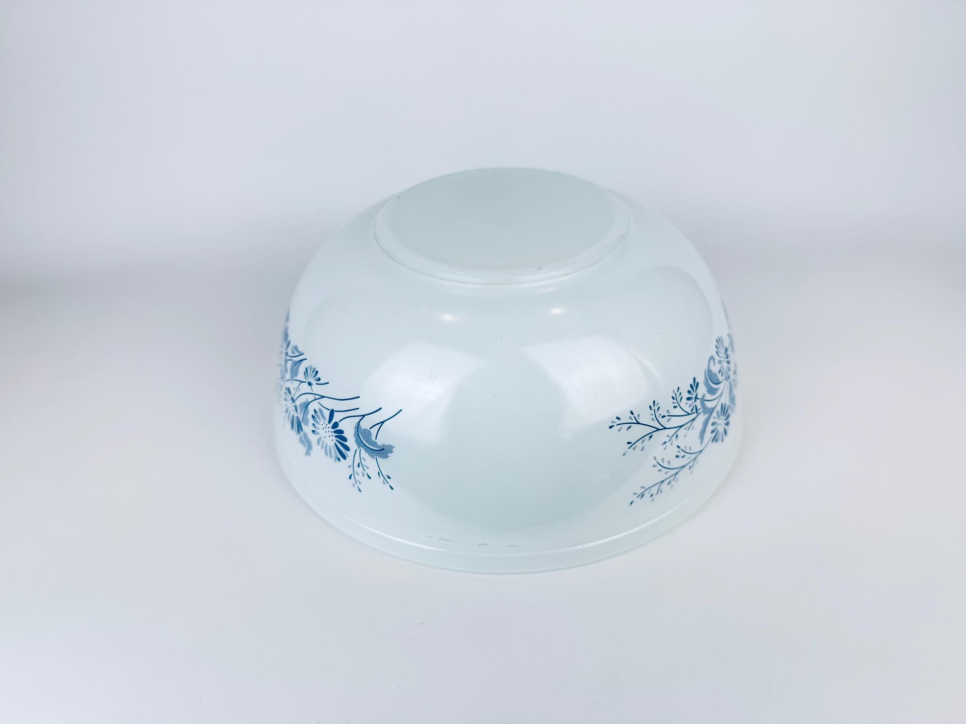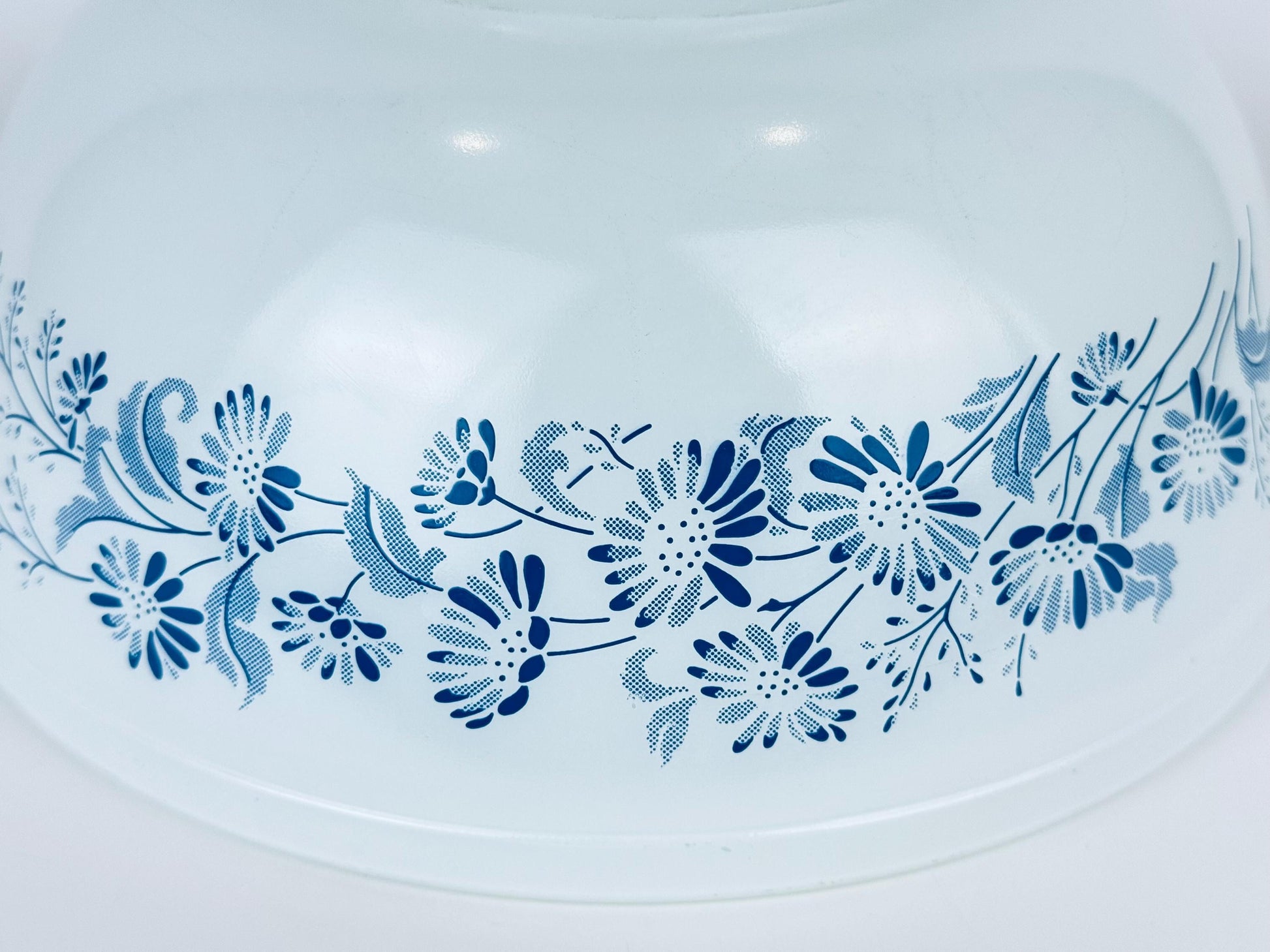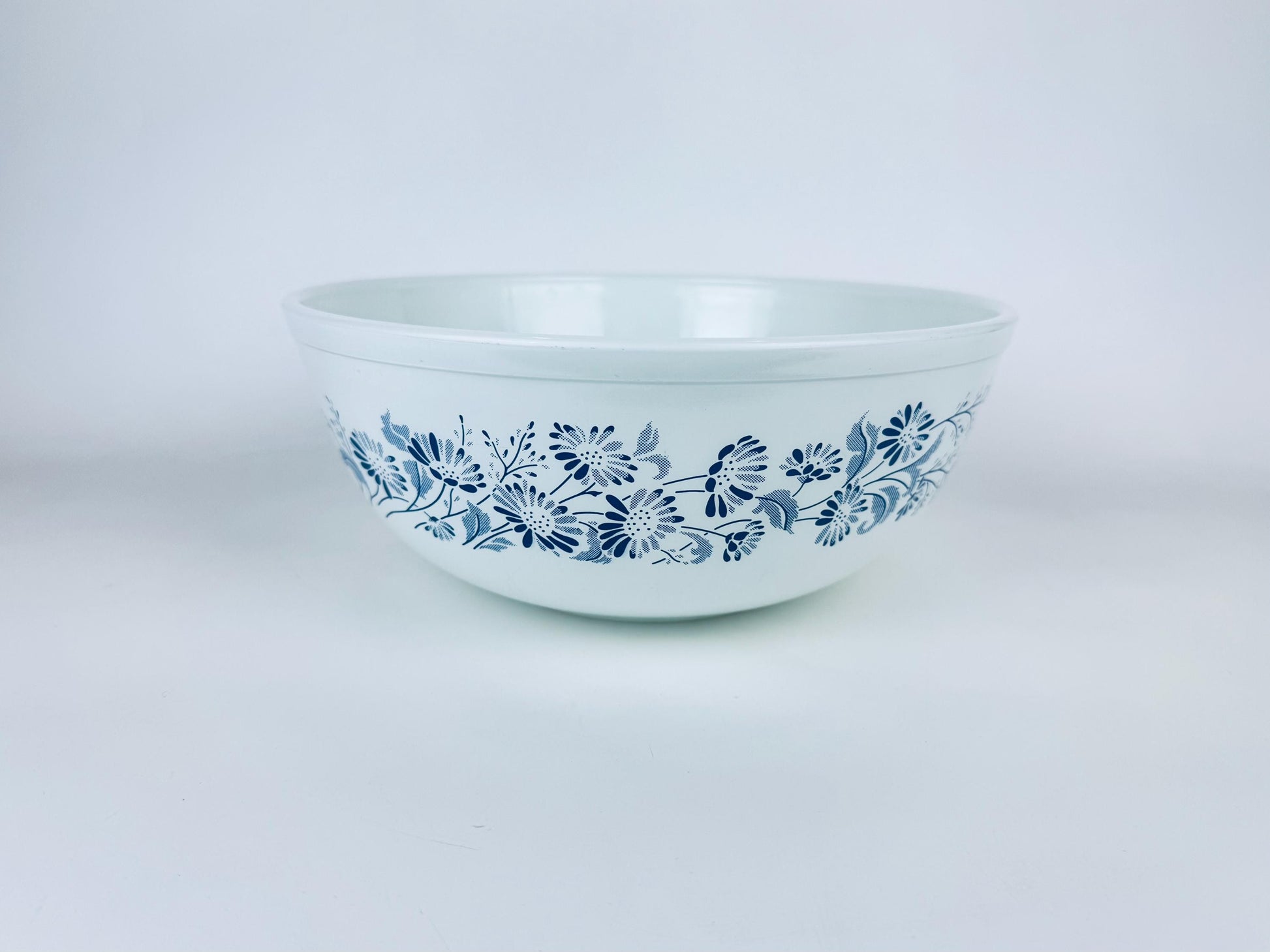 💙 A softly luminous Pyrex Colonial Mist #404 mixing bowl, showcasing its iconic white-on-blue floral motif from the early 1980s, brings a serene touch of Americana to any kitchen. Its generous 4-litre capacity makes it ideal for mixing, serving, or displaying as a classic collector’s accent piece.